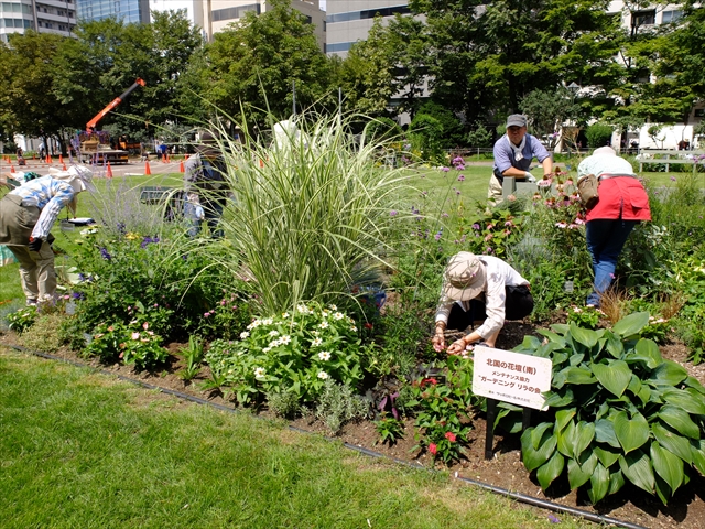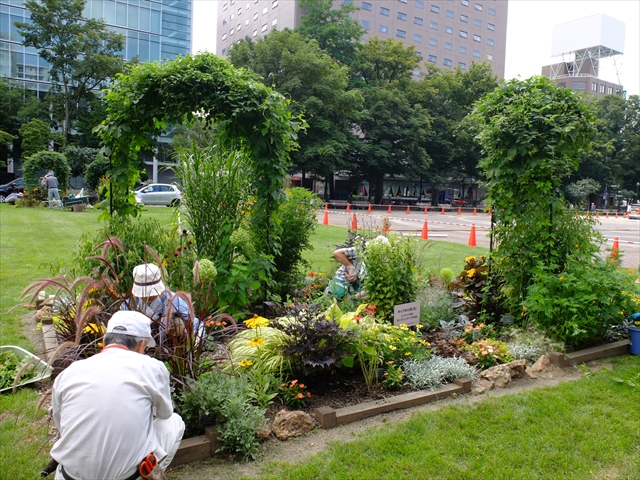 西8丁目の花壇では、ガーデニングリラの会のみなさんが植栽デザイン、植え込み、メンテナンスなどをしています。ガーデニングリラの会とは、さっぽろまちづくりガーデニング講座の前身であるさっぽろ緑花園芸学校の卒業生が中心となって活動しているガーデニングボランティアの団体です。8月22日(土)のガーデニング講座実習もここで行いました。