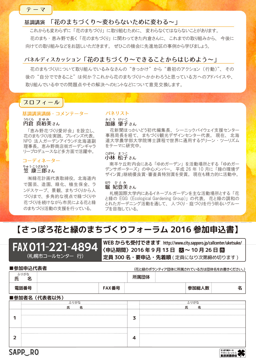 さっぽろ花と緑のまちづくりフォーラム2016 参加申込受付中♪