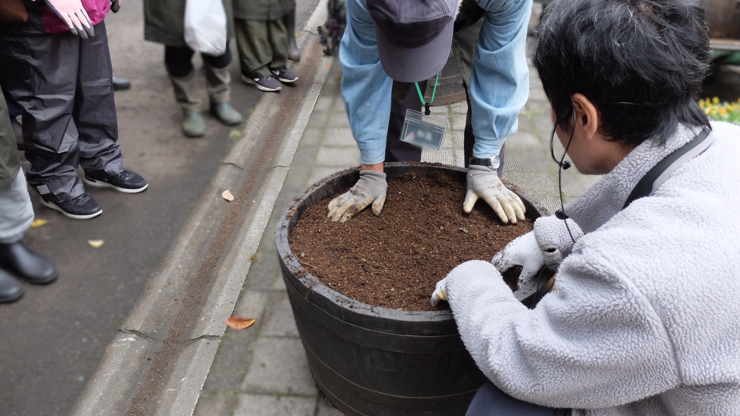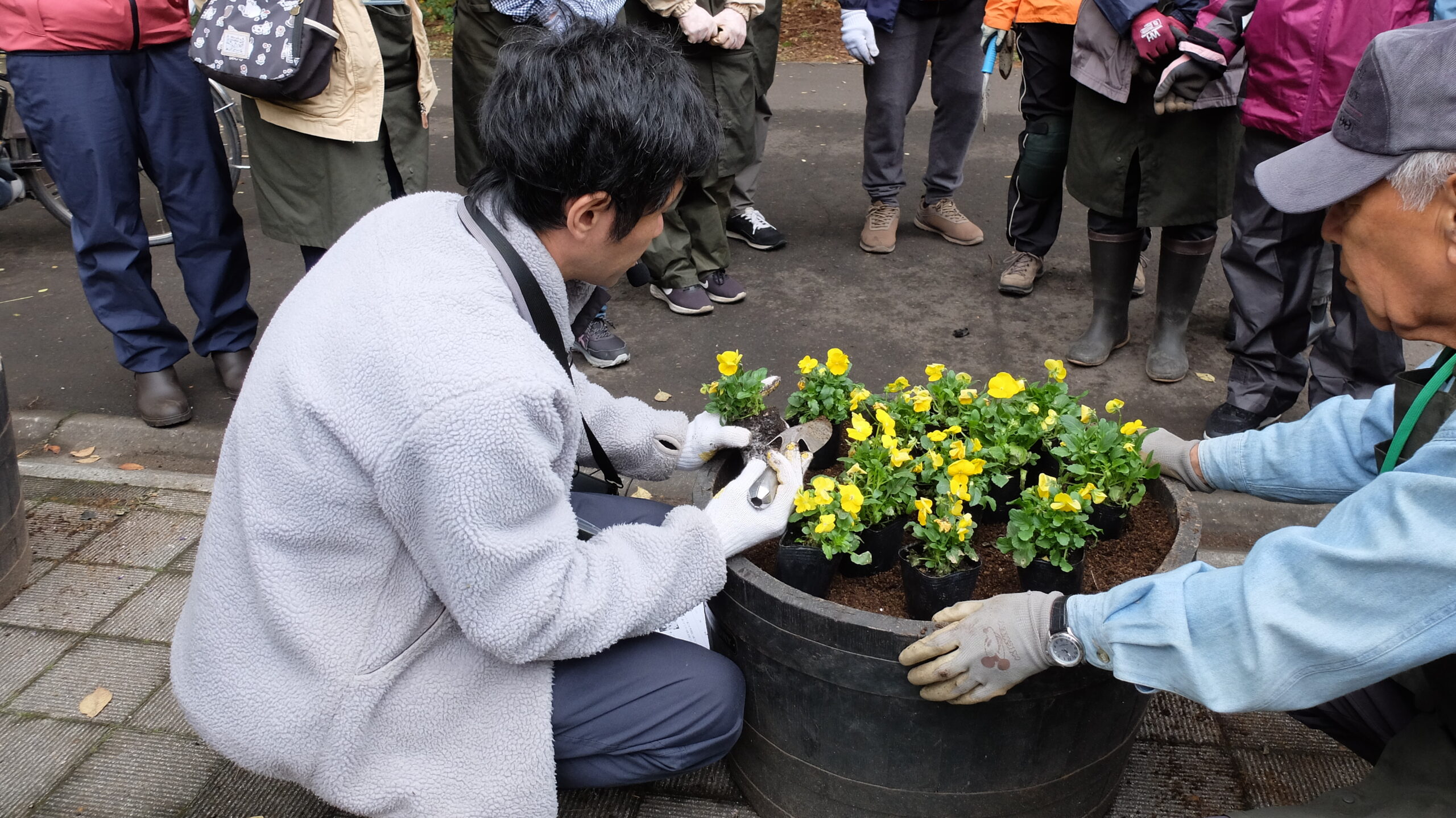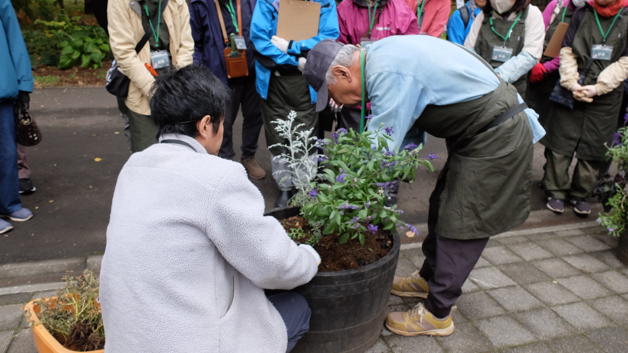 コンテナ内の植物の抜き取り→土の整地→球根の植え込み→パンジー・ビオラの植栽と、作業工程を段階的に区切りながら、講師のデモンストレーションに続いて受講者も植え替えていきます。