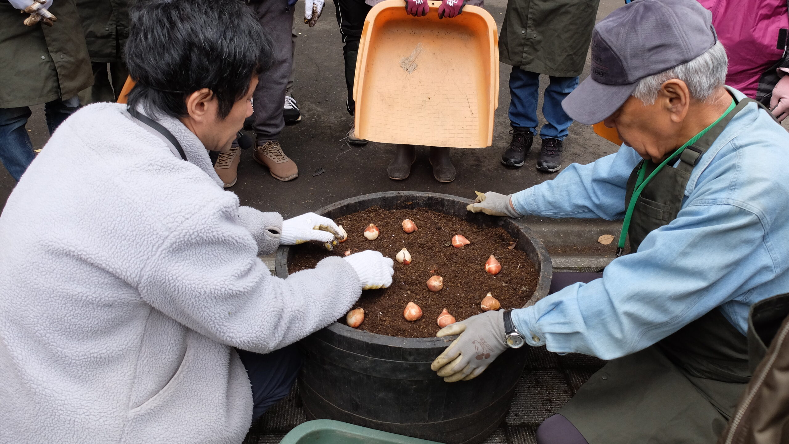 みなさん手慣れた様子で、これまでの講座で習得した学びを活かされていて、あっという間に秋植え球根のコンテナガーデンが完成しました。
