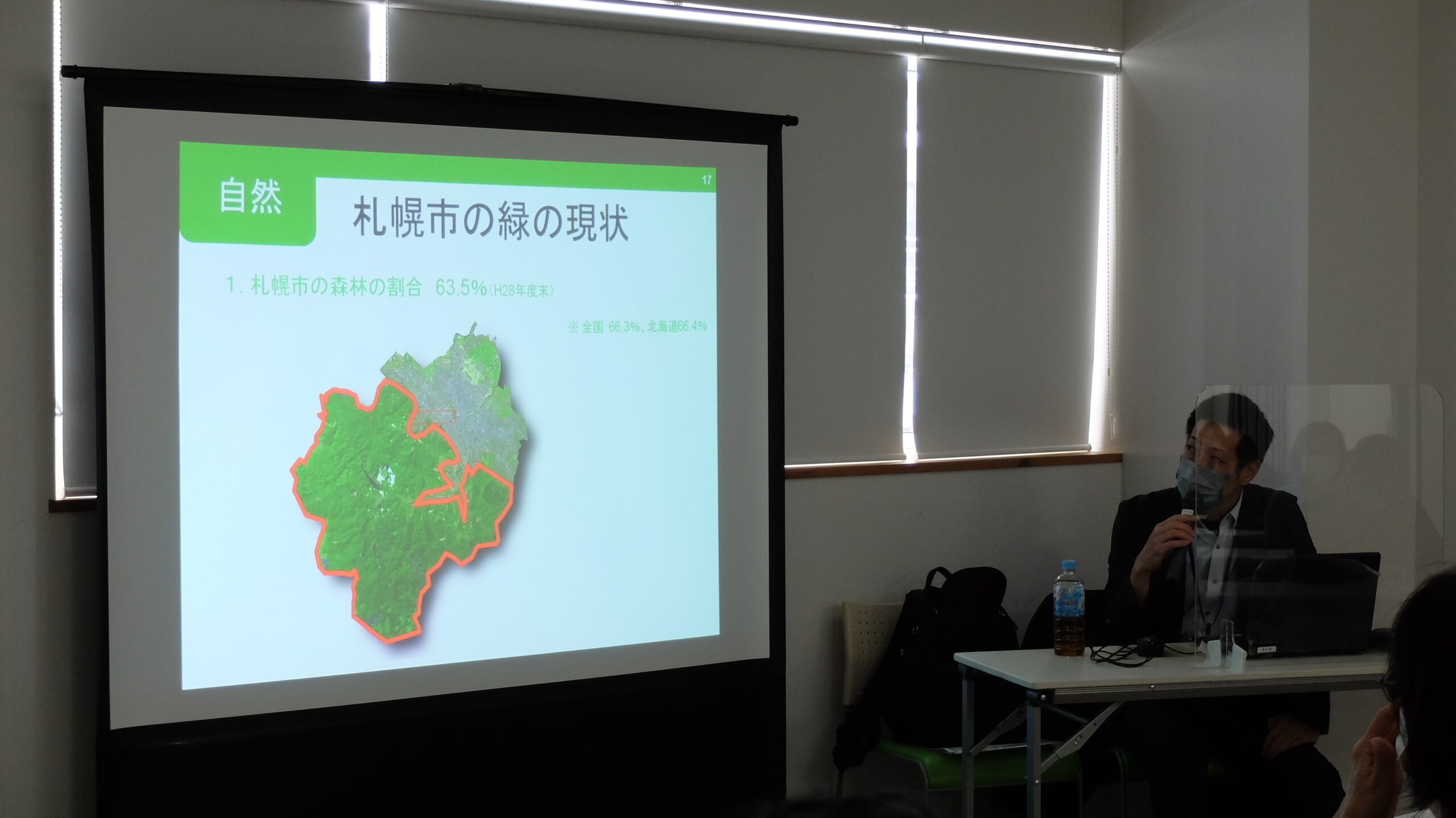はじめに、「札幌市みどりの基本計画」の説明がされました。「みどりの基本計画」とは、法律に基づき市町村が緑地の保全や緑化の推進について定める総合的な計画で、札幌市では時代の変化に応じて「みどりの基本計画」を見直し、計画的に緑化を進めています。