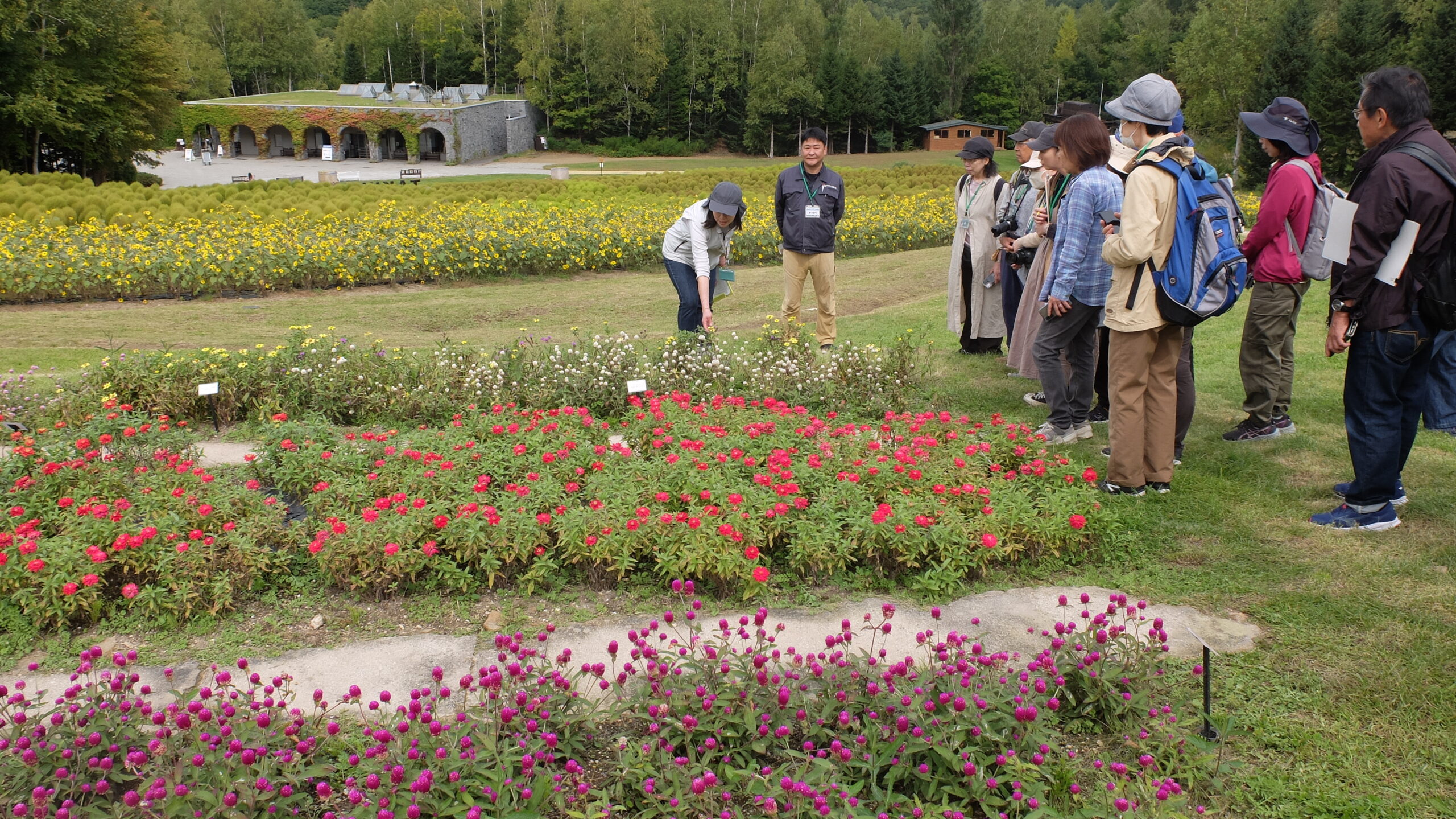 滝野すずらん丘陵公園には、カントリーガーデンを案内する「フラワーガイドボランティア」と滝野の森ゾーンの魅力を伝える「滝野の森クラブ」の2つのボランティア団体が活動しているそうです。今回の見学会では、フラワーガイドボランティアの佐藤さん、竹内さん、横堀さんにご案内いただき、季節によって移り変わるカントリーガーデンの見どころをたっぷり紹介していただきました。