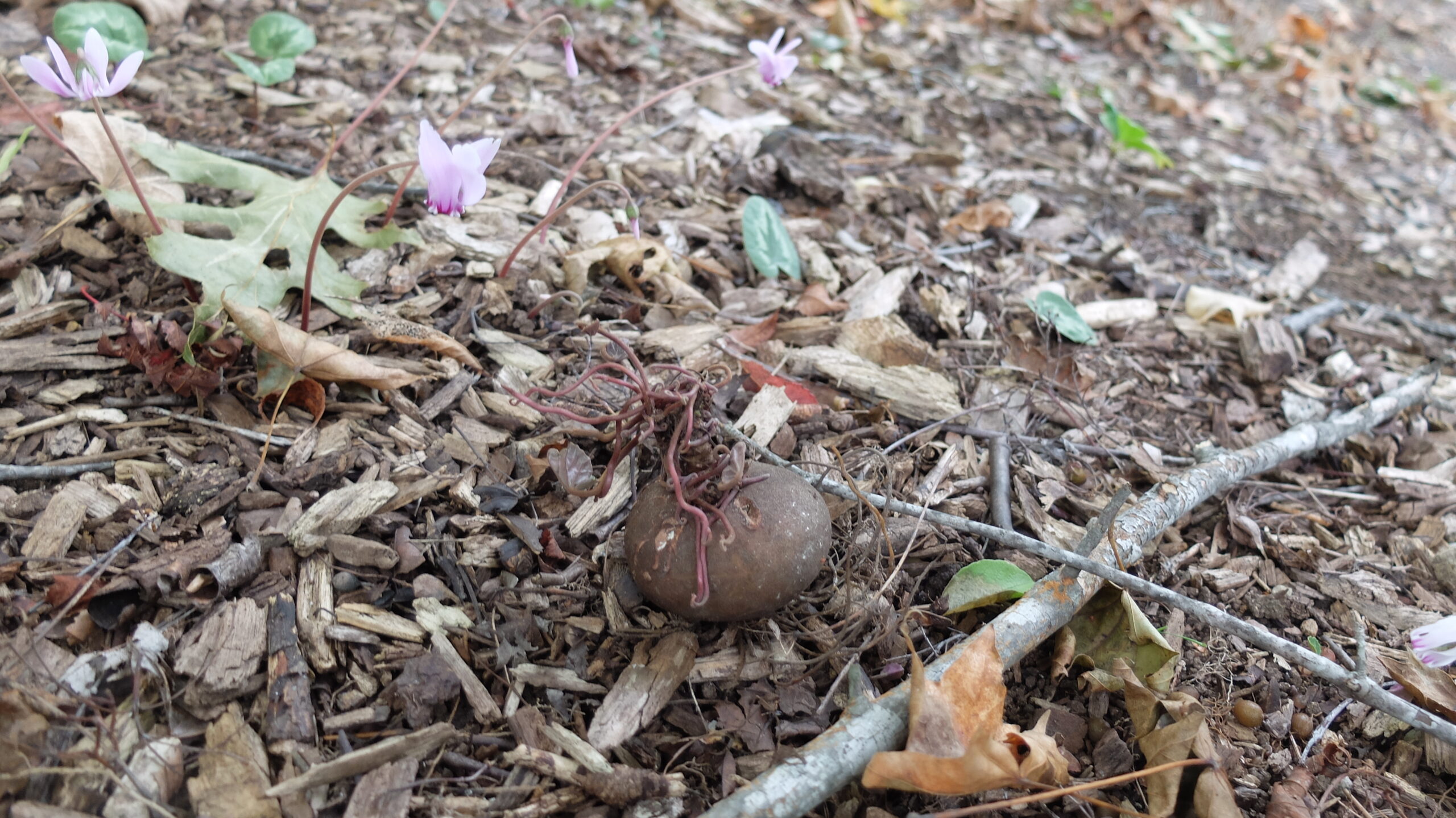 原種のシクラメン「シクラメン ヘデリフォリウム」が開花していました。花と一緒に球根が顔を出している様子も見られました。