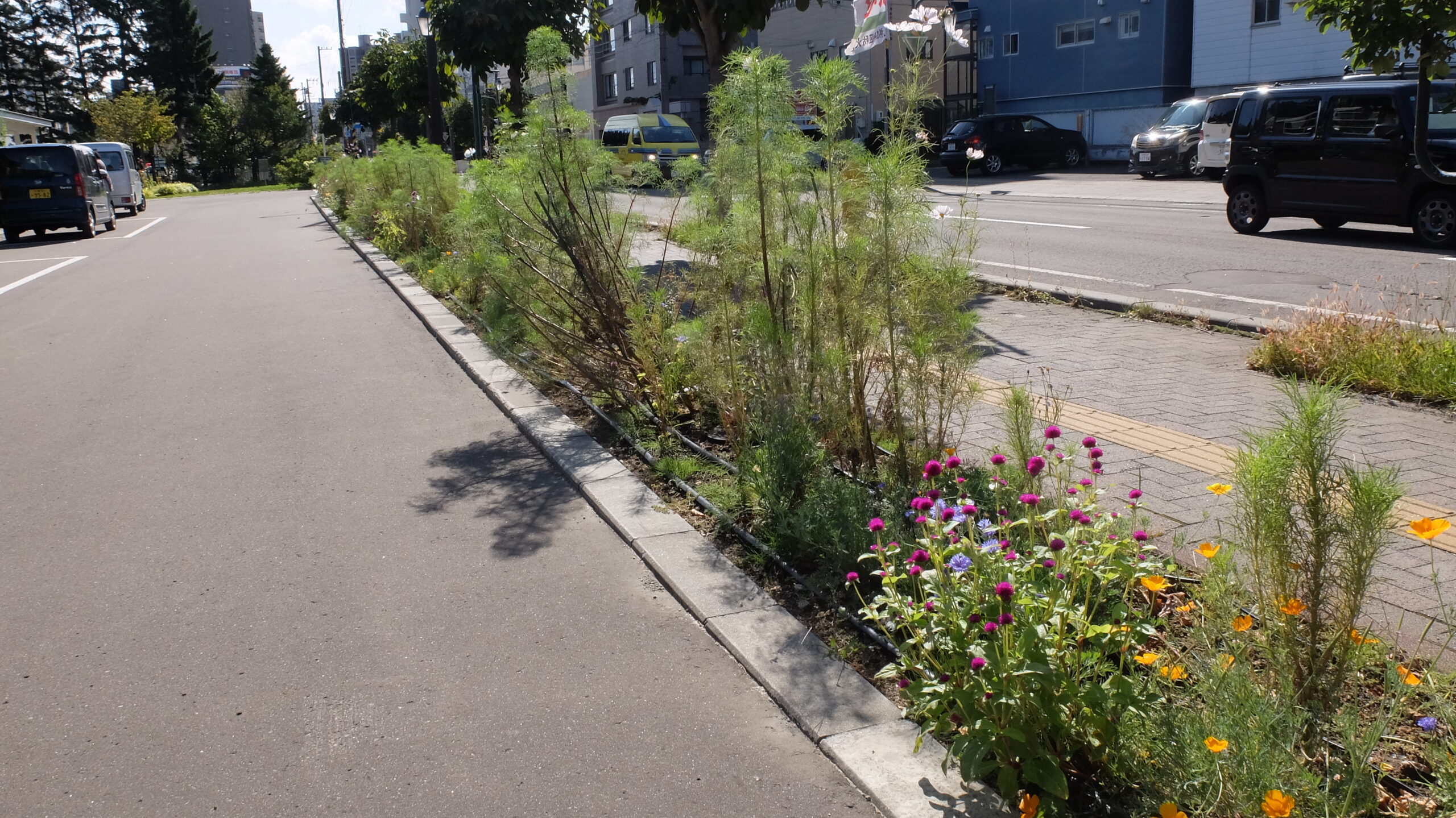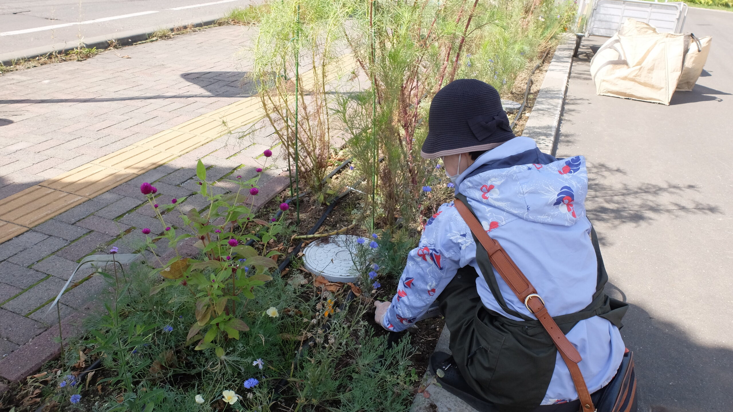 前回のメンテナンスから1か月が経ち、引き続きセンニチコウやバーベナボナリエンシス、カリフォルニアポピーが咲き、コスモスも開花し始め、さらに背丈も伸びました。しかし、最近の大雨や強風で、コスモスは根元から茎が曲がったり、折れてしまっているものもみられました。