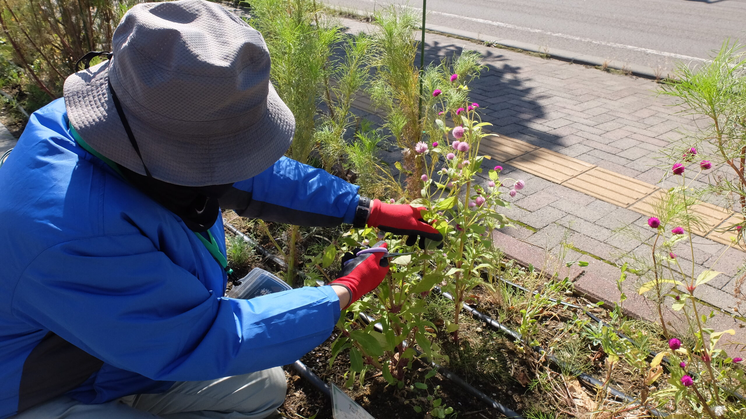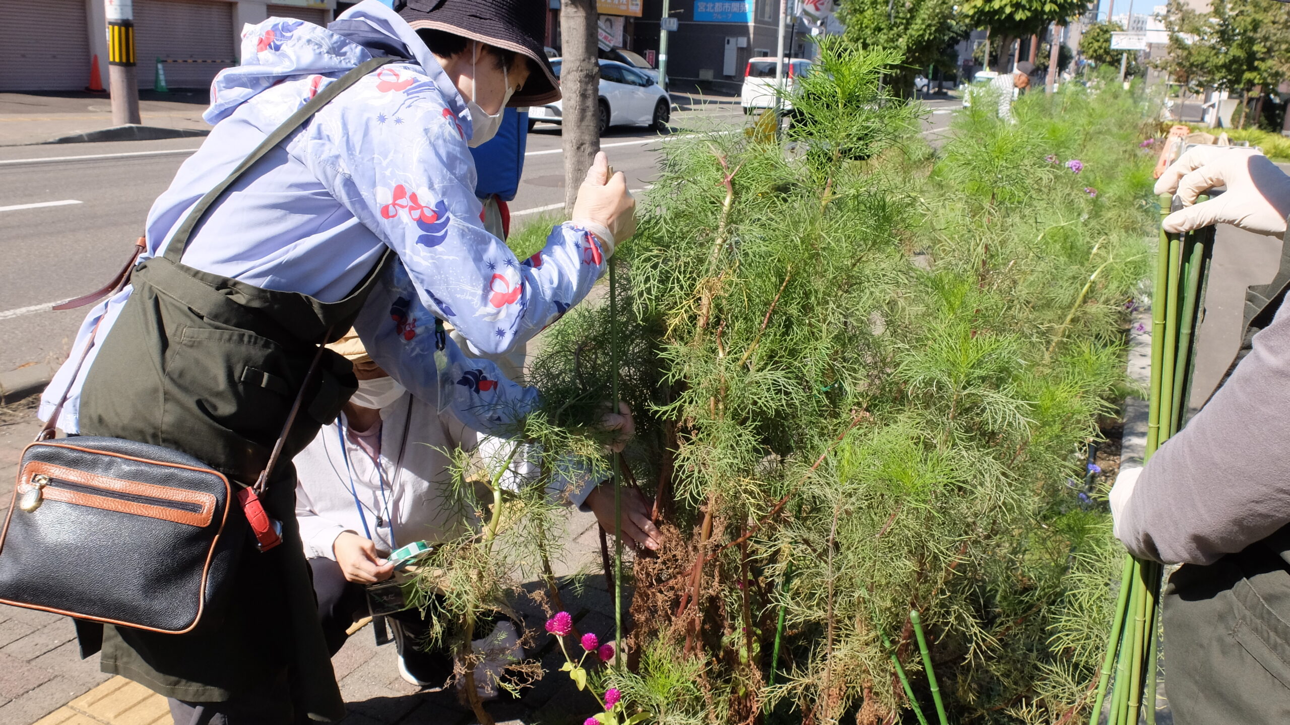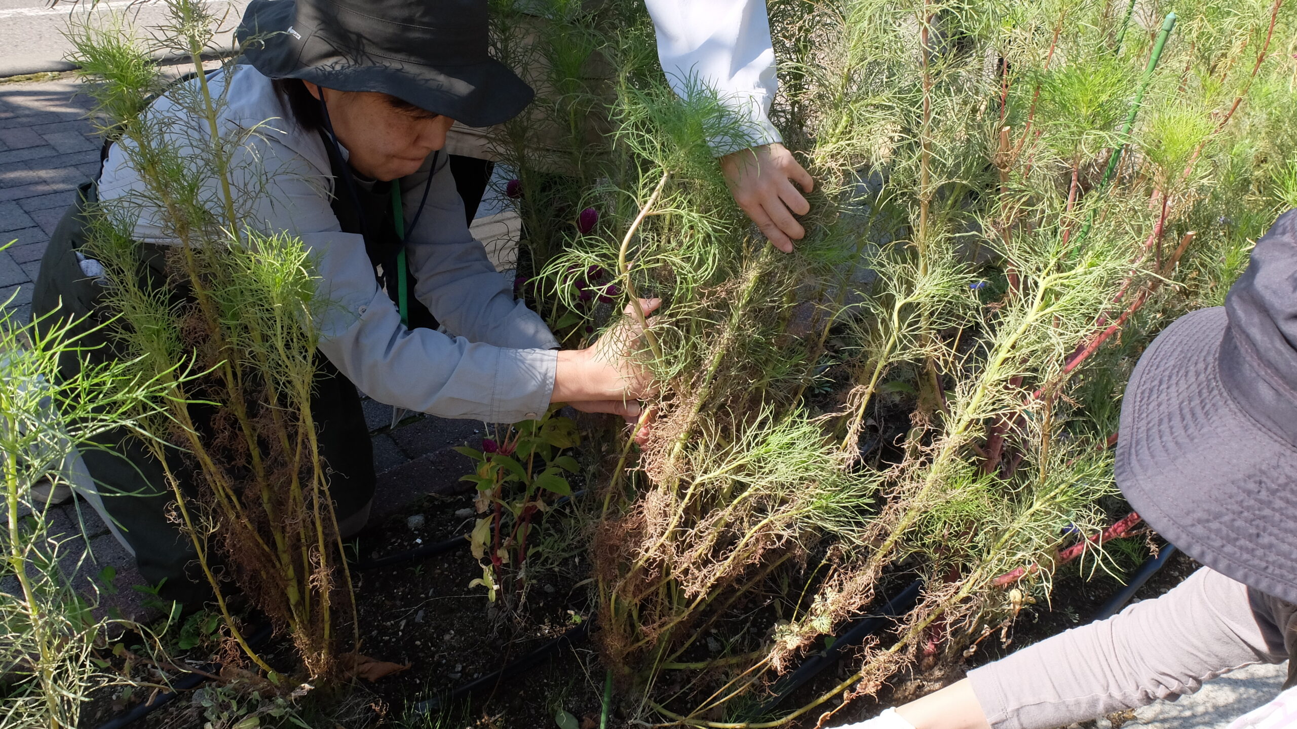 今回はまず、倒れかけているコスモスに支柱を立て、根元から折れている枝や花壇からはみ出している枝を根元から切る作業から始めました。