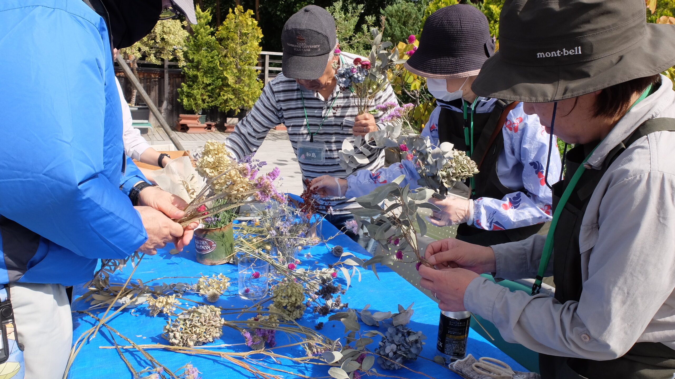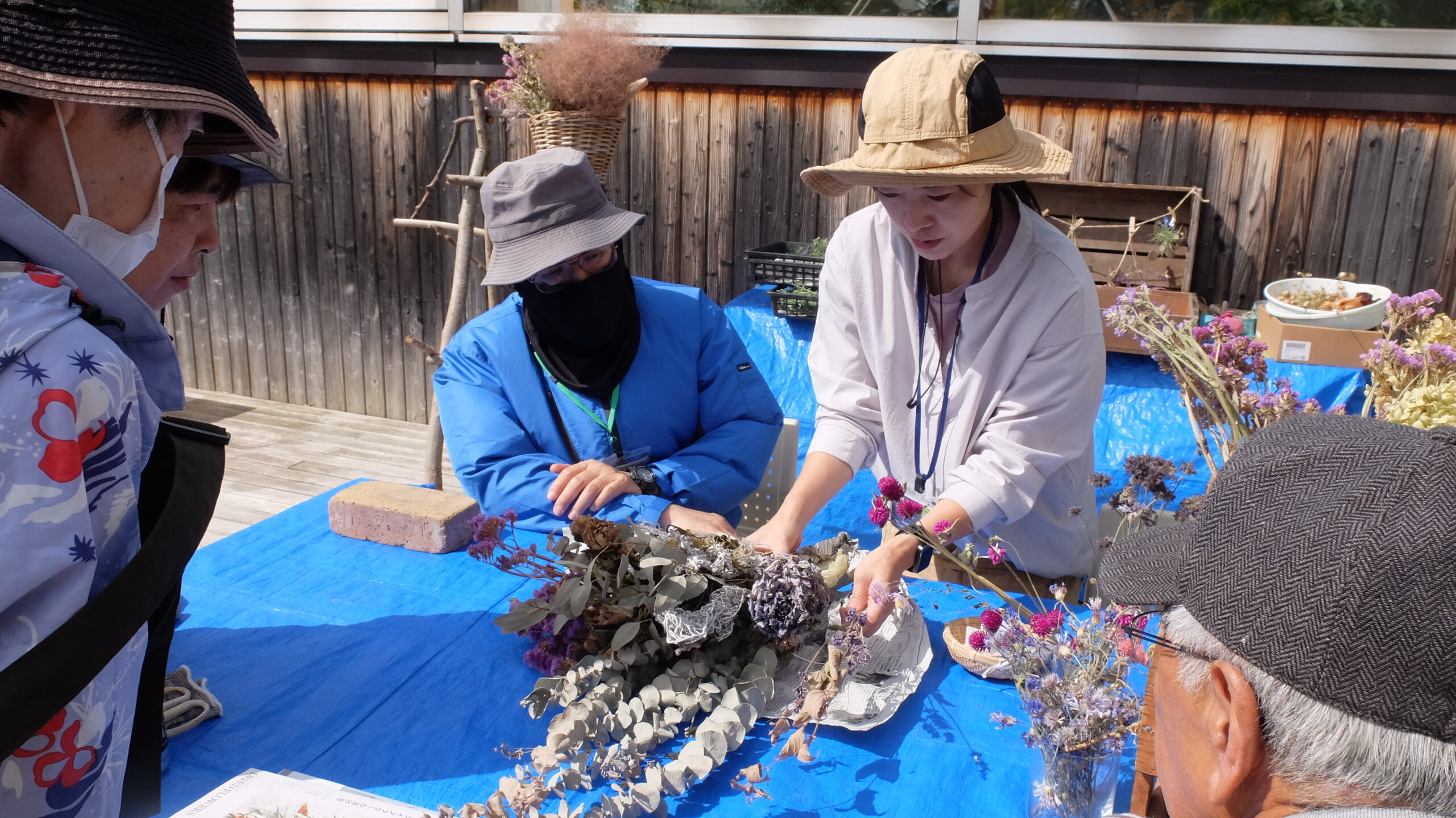 花壇のメンテナンスを終えた後は、緑のセンター2階のルーフガーデンに場所を移し、採取したドライフラワー用の花々を使ってスワッグを作りました。講師のデモンストレーションのあと、みなさんも作製します。
