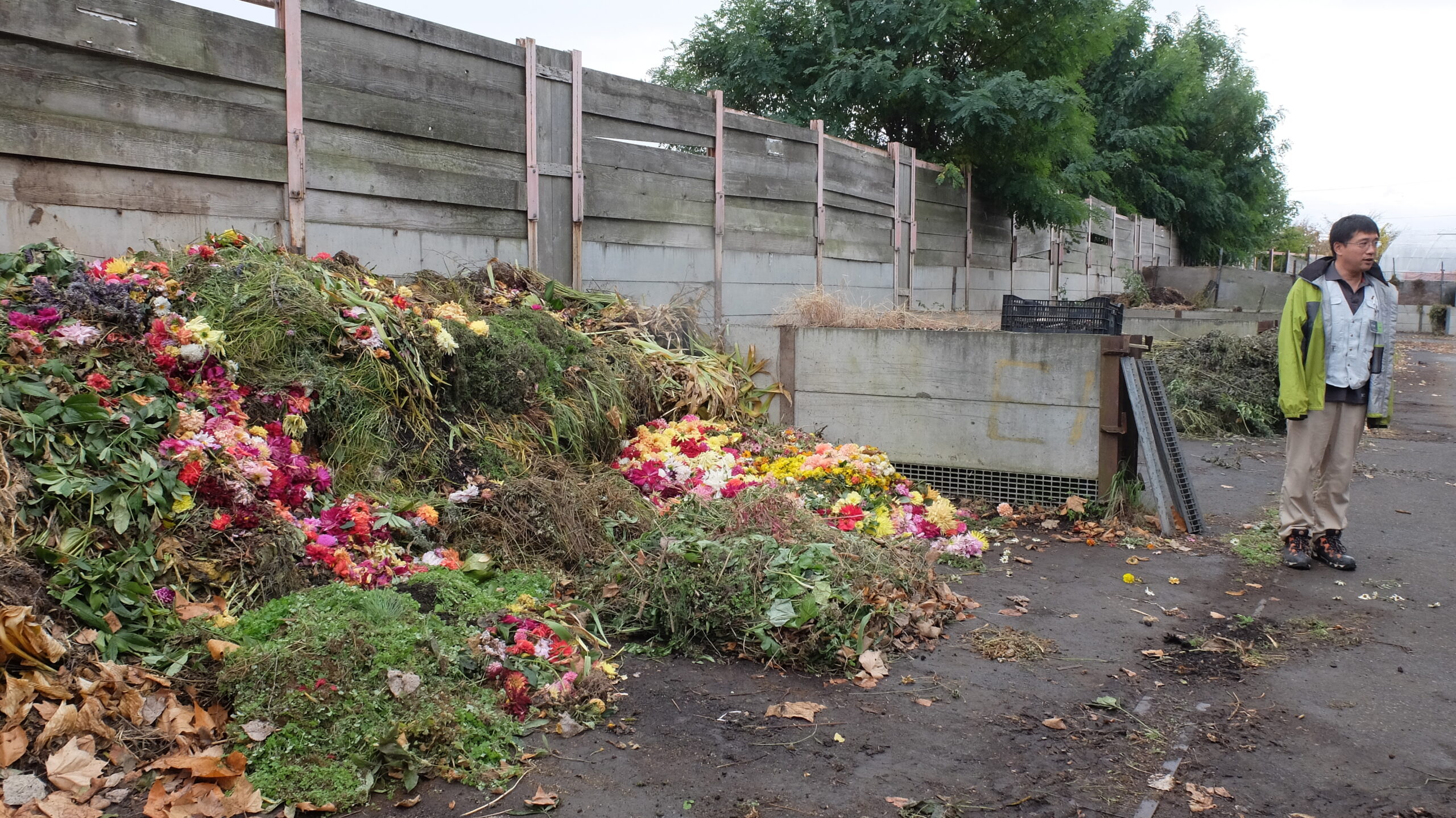 公園管理をする中で発生する草や花がらを使用してつくる「草堆肥」や落ち葉、樹木の茎などの植物残渣から作る「落ち葉堆肥」を実際に見て学びました。