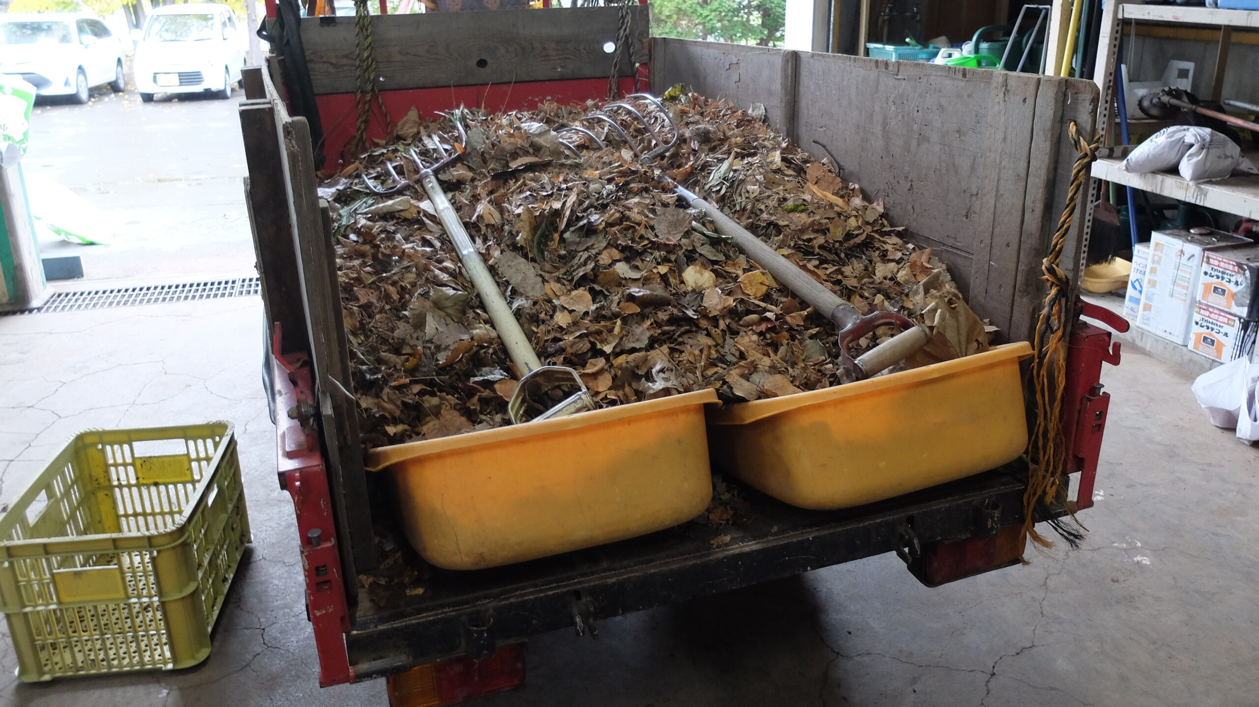 荷台いっぱいに積まれた落ち葉からは、コンテナ2個分の落ち葉堆肥が出来るそうです。