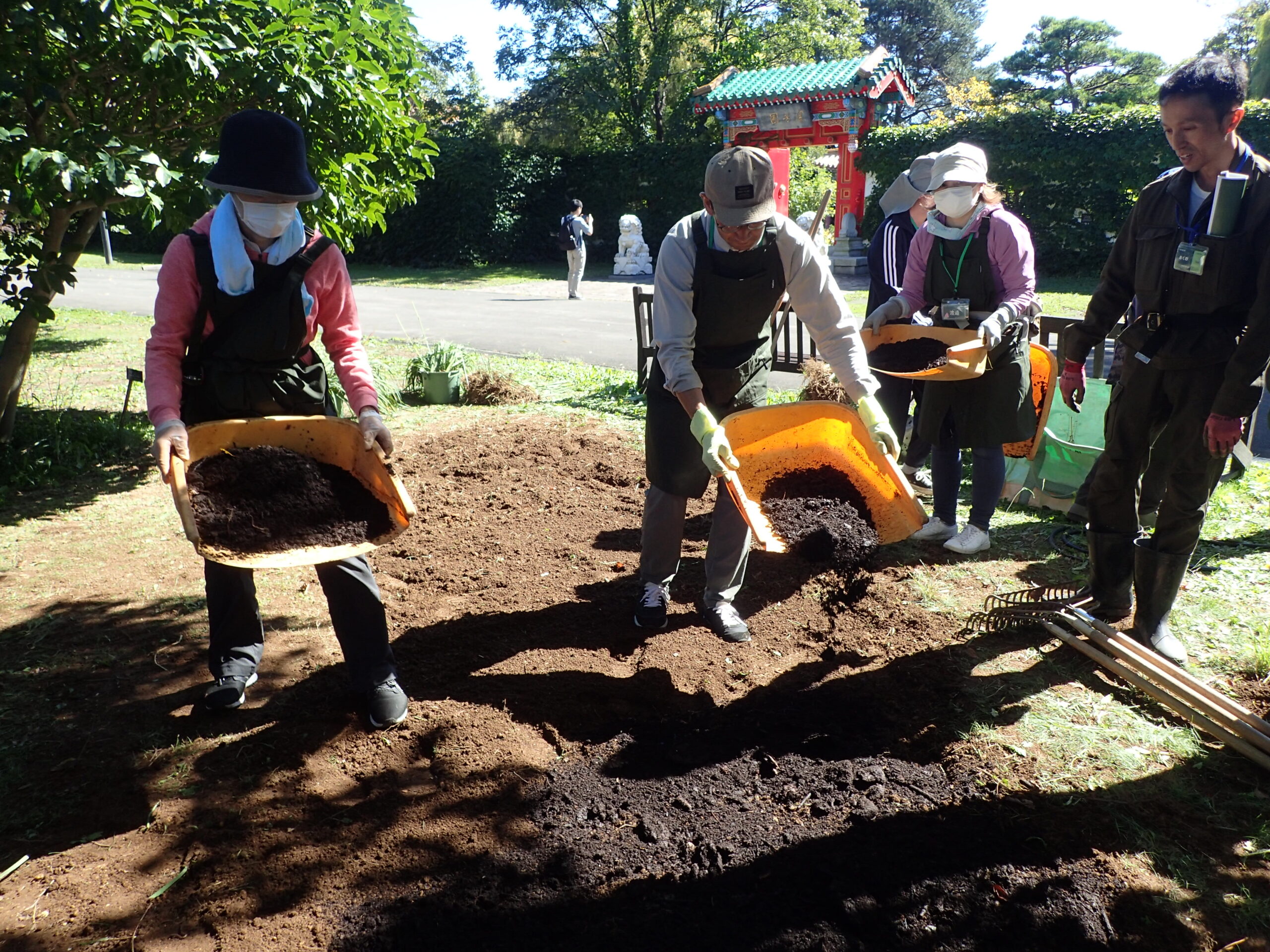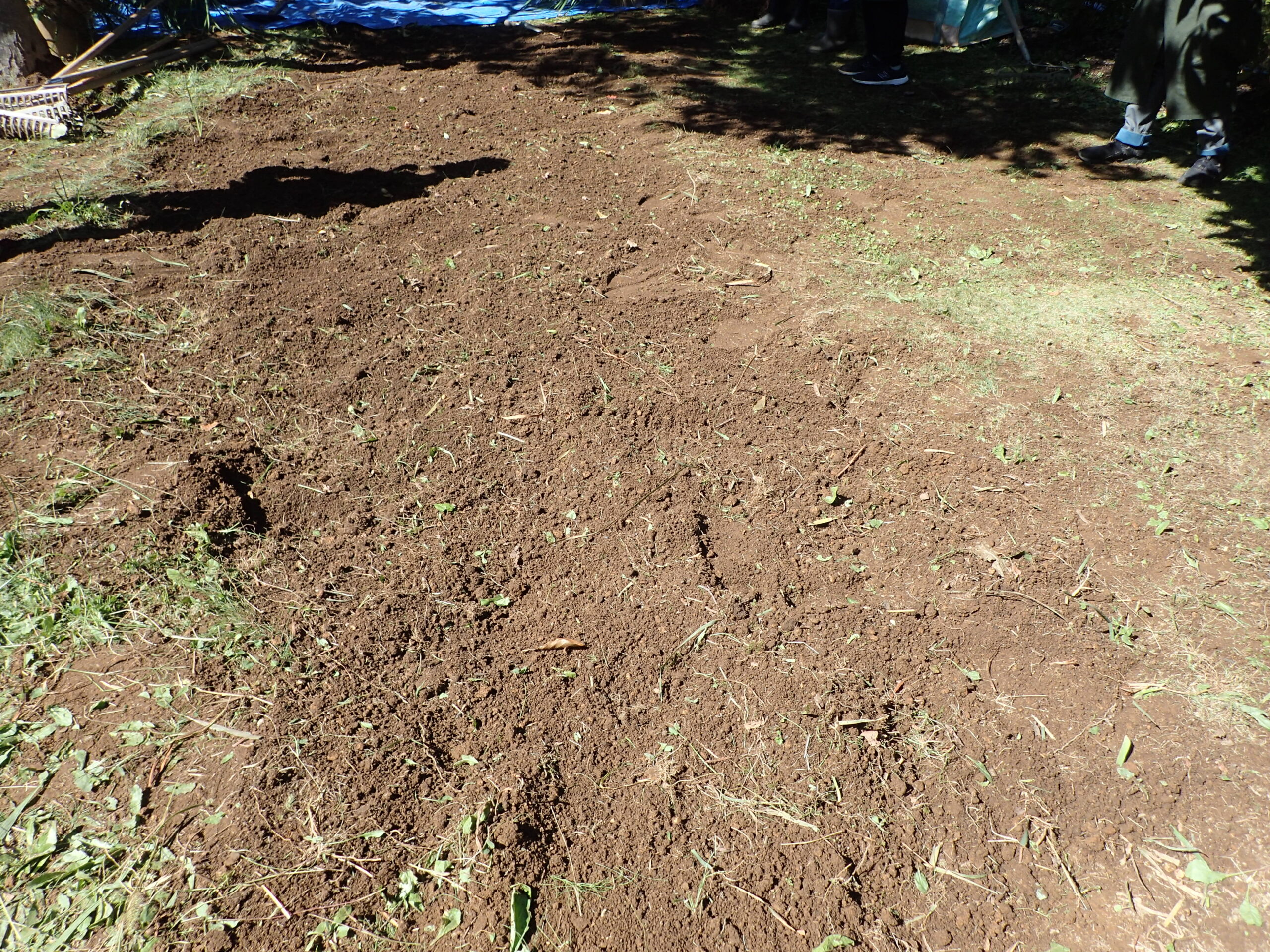 続いて、表面の土と地中の土を入れ替える「天地返し」を行い、残った草や根をレーキなどを使って取り除きます。その後、落ち葉堆肥などの土壌改良材を入れて耕運、転圧を行い、床作りをします。