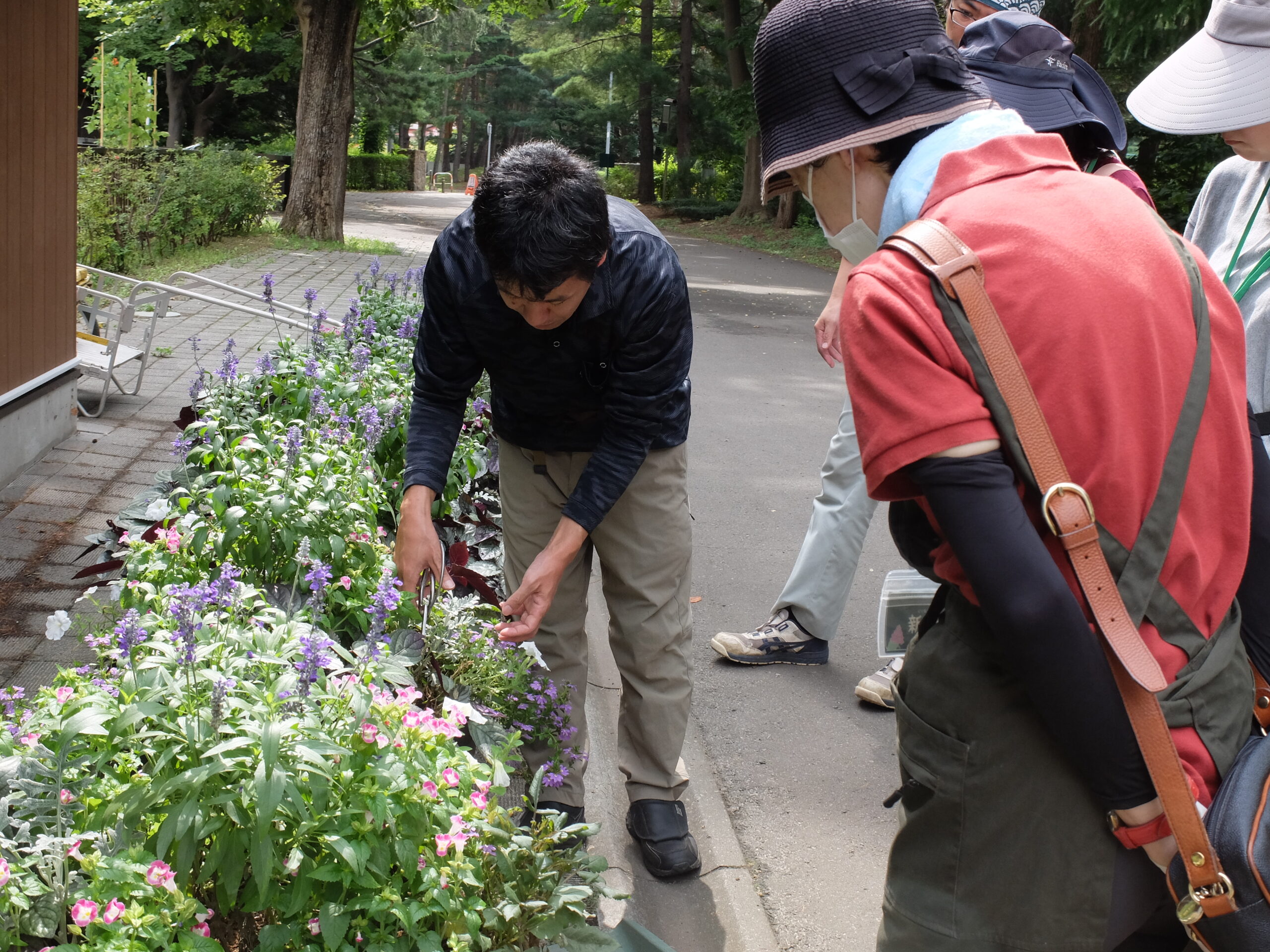 講師からそれぞれの花の花がら摘みの方法を教えてもらい、参加者もお手入れを行っていきます。