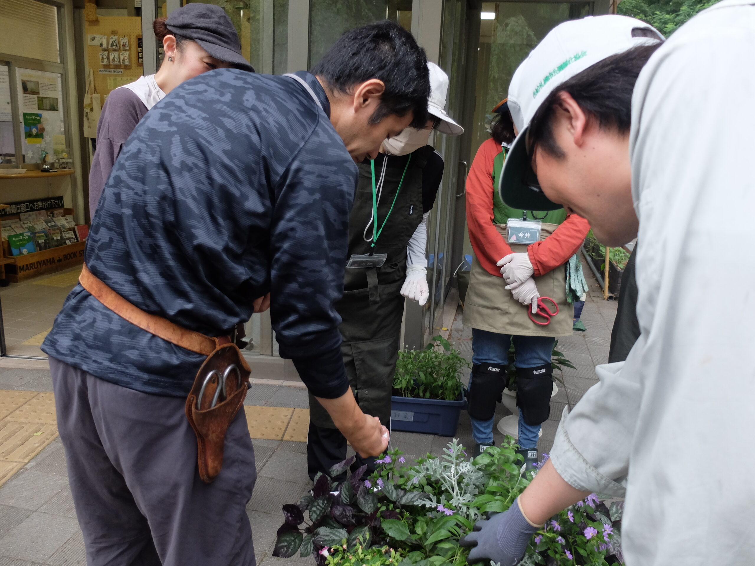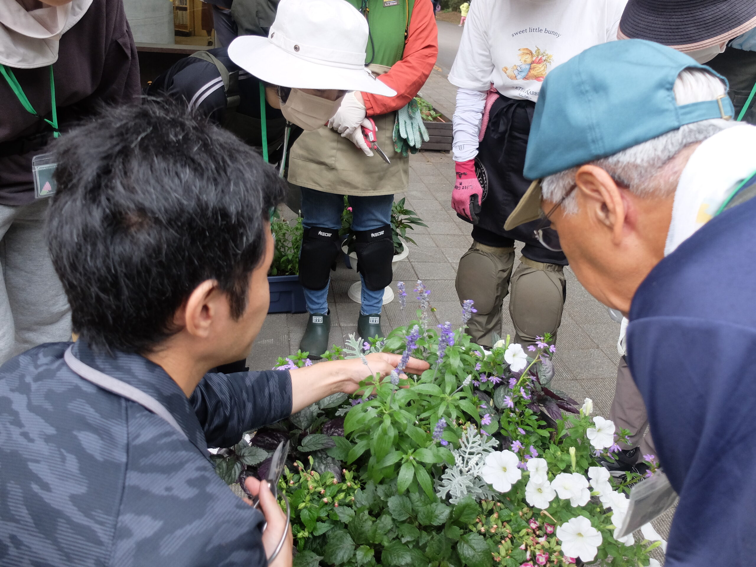 花壇の見学後、受講者のみなさんは花壇4面に分かれて、それぞれの花壇の状況に合ったメンテナンスの方法を教わりました。