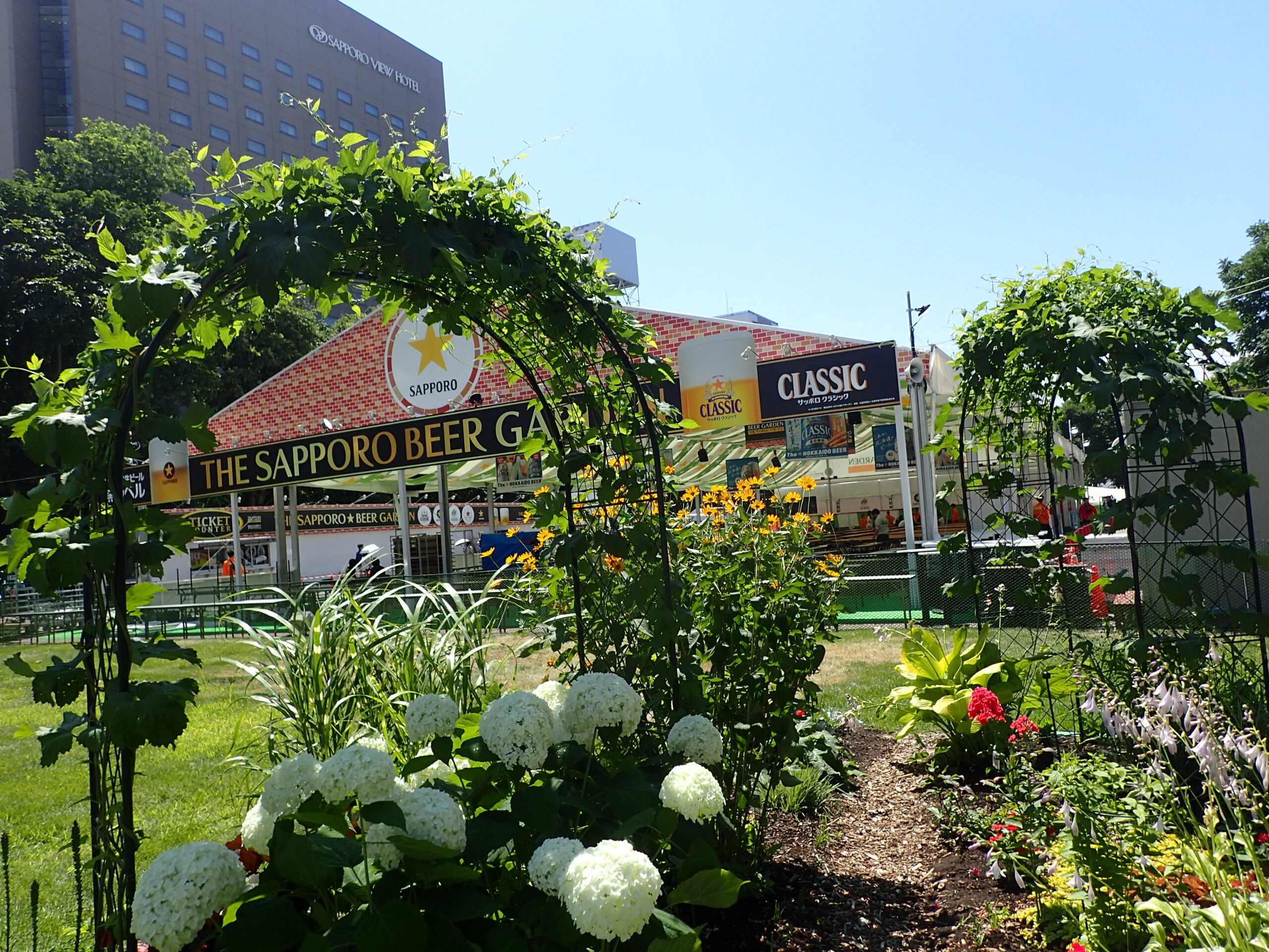 東側の2面は白・青・紫などの寒色系の植物を多く用いて北国の爽やかなイメージでデザインされた「北国の花壇」、西側の2面は、ホップのアーチをメインに黄・オレンジ、赤など暖色を主に用い、温かみのある牧歌的な北海道を表現した「ホップの小径」があります。南側の「ホップの小径」では、アーチ同士をホップの蔓で繋ぐように誘引しており、小径を通って、じっくりとホップの様子を観察することができます。