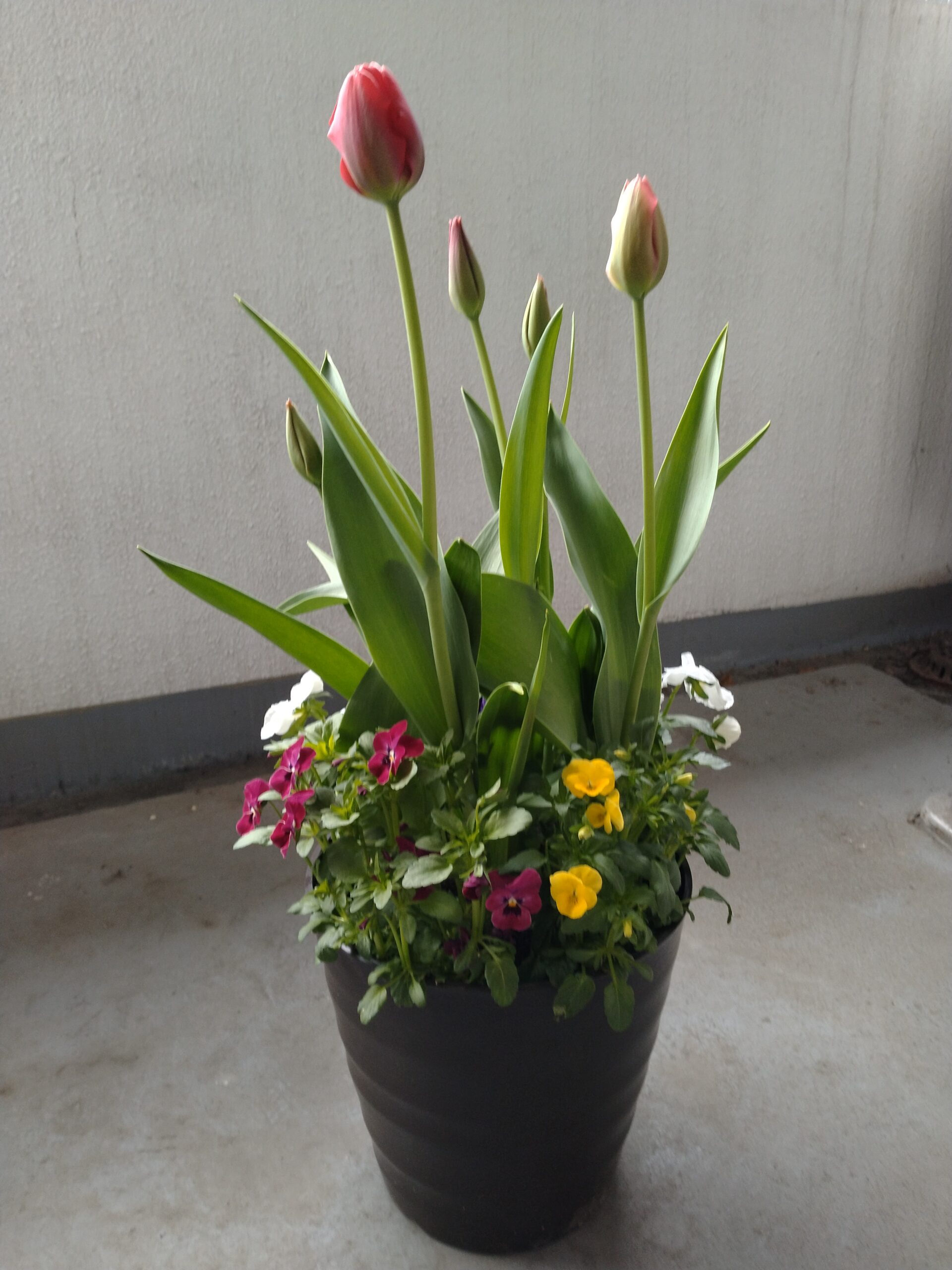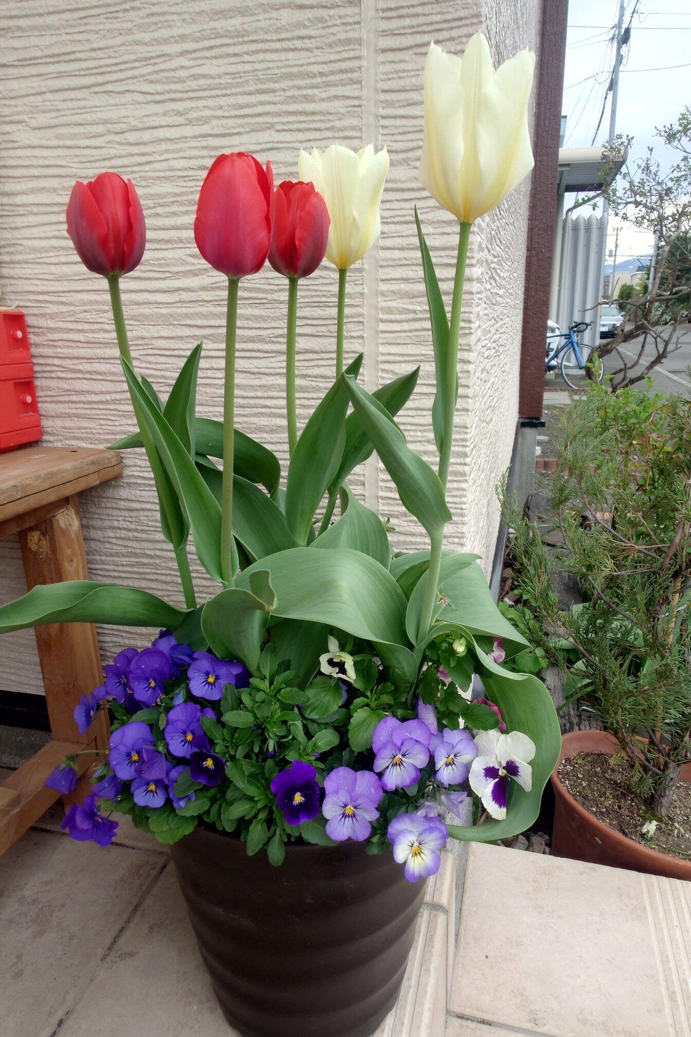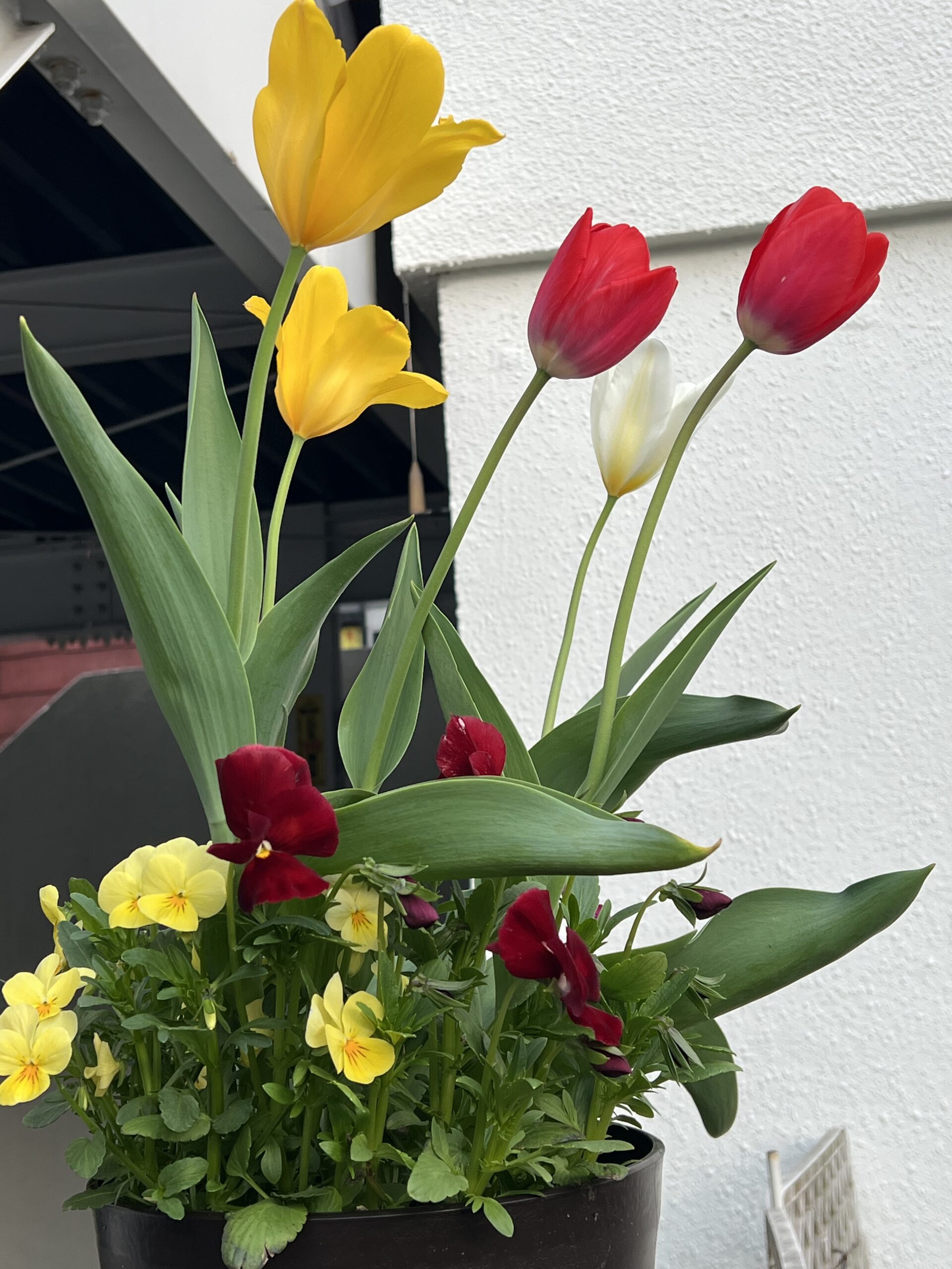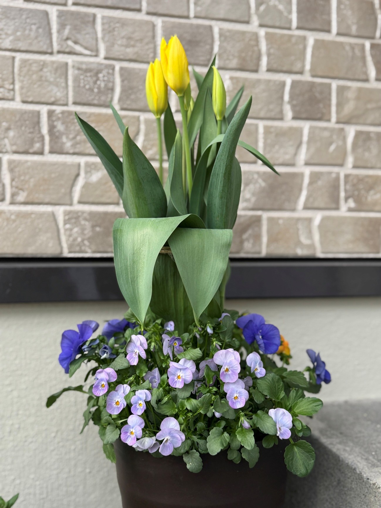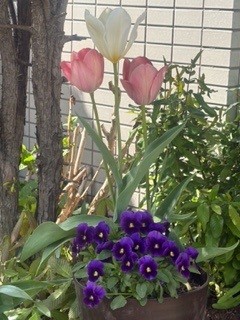 昨秋に寄せ植えしたチューリップとパンジー・ビオラの写真が届きました!