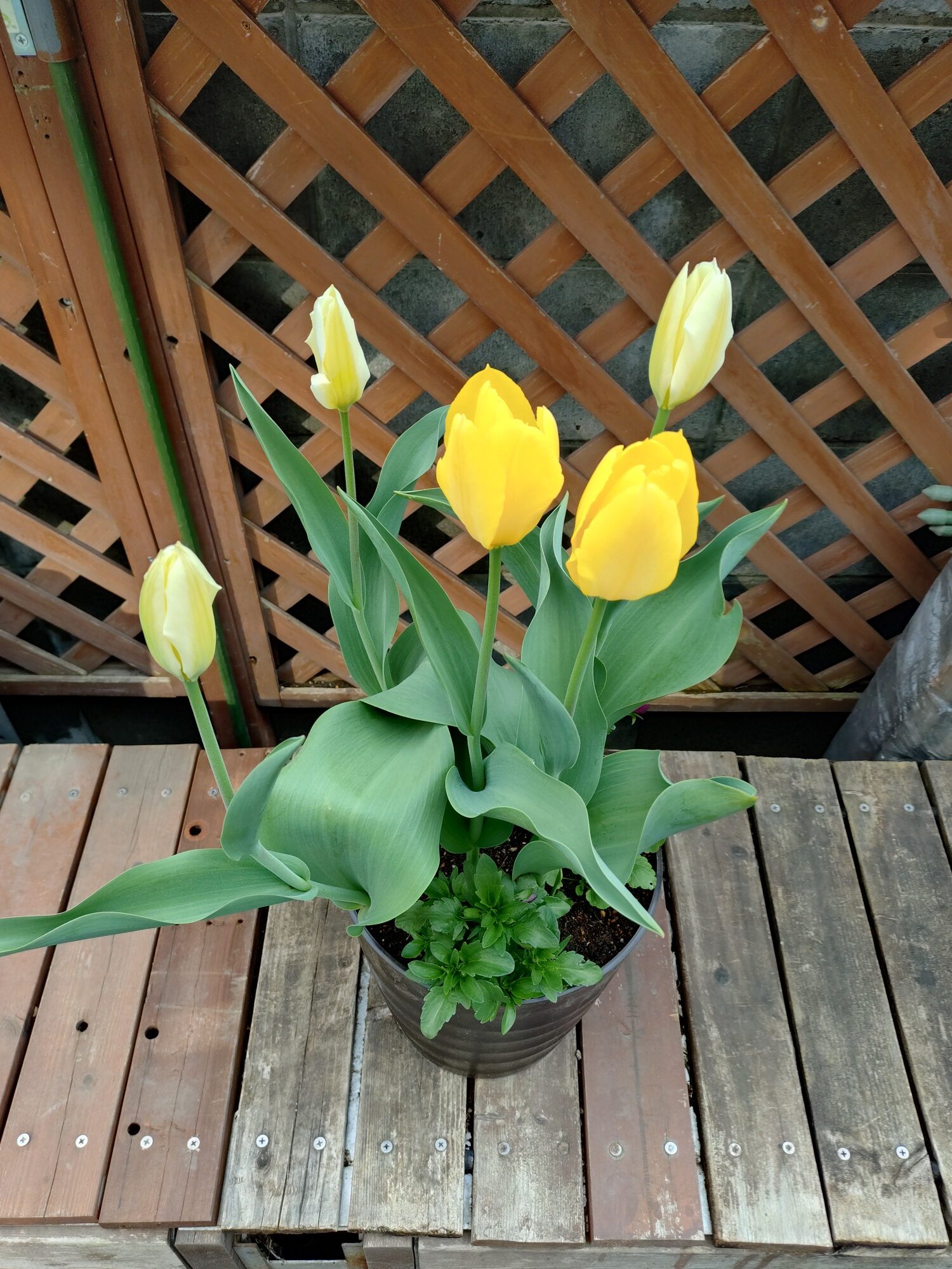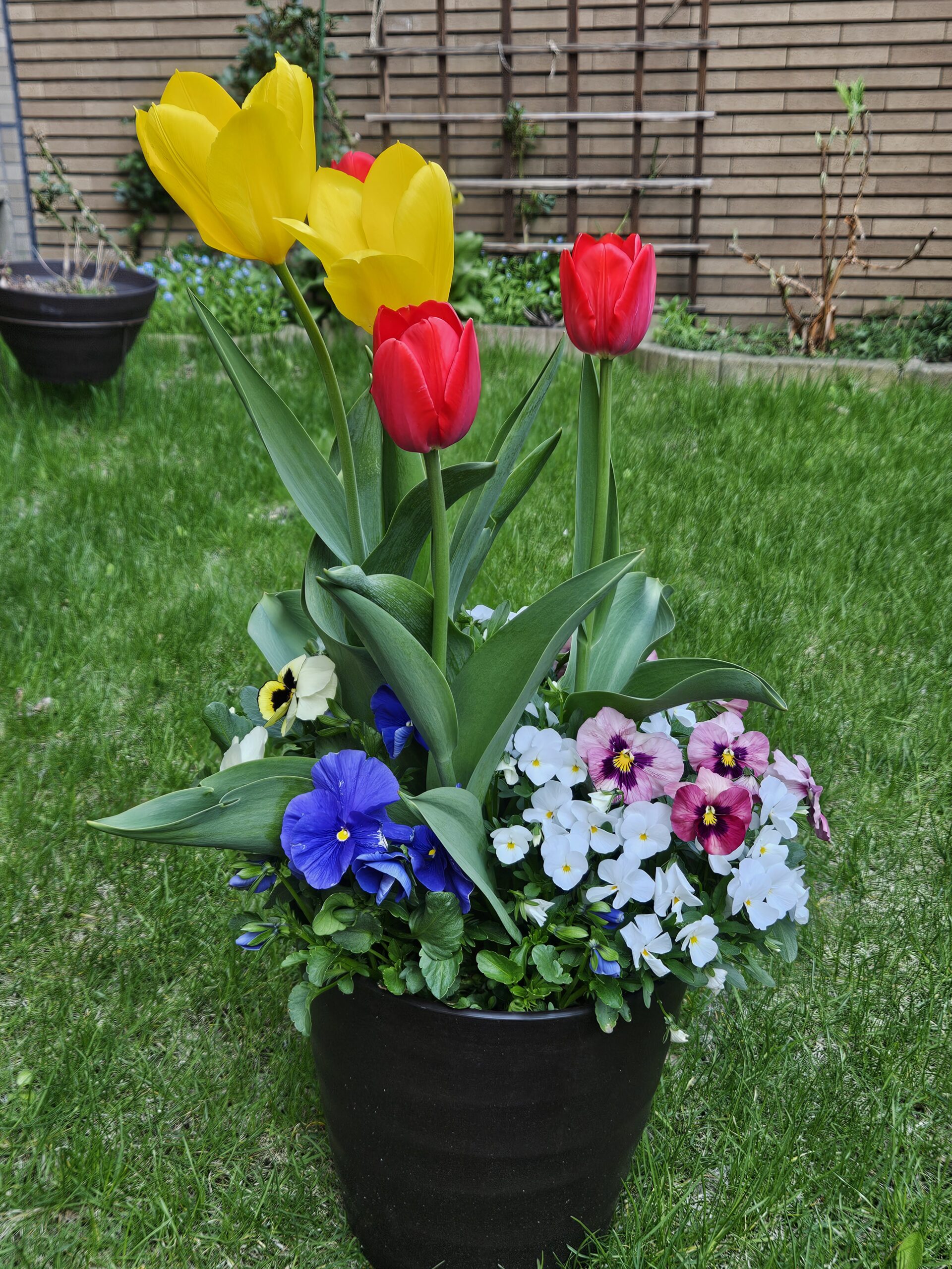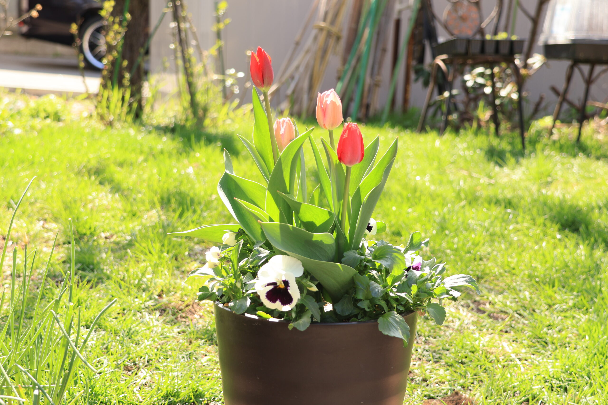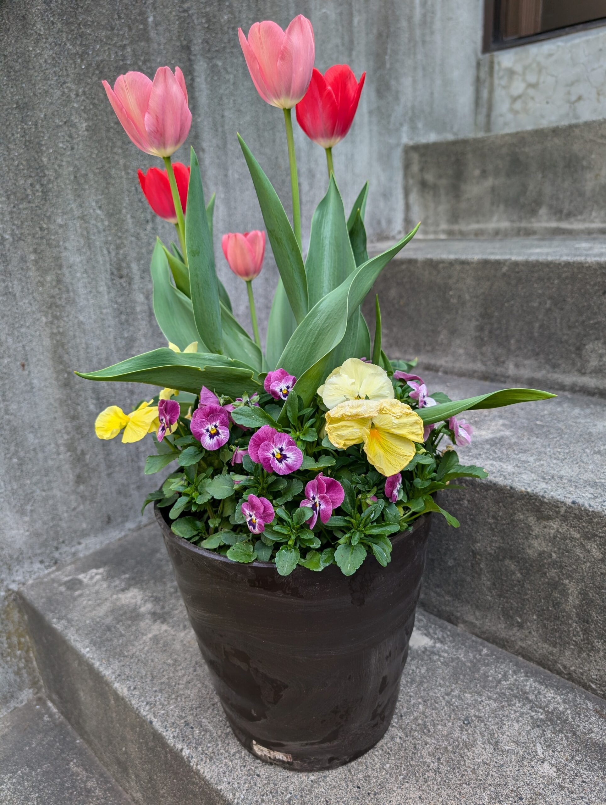 昨秋に寄せ植えしたチューリップとパンジー・ビオラの写真が届きました!