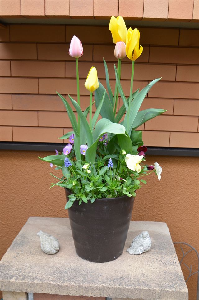 チューリップ・パンジー・ビオラに加え、ムスカリや鳥のガーデンオーナメントが素敵な空間をつくりあげています。