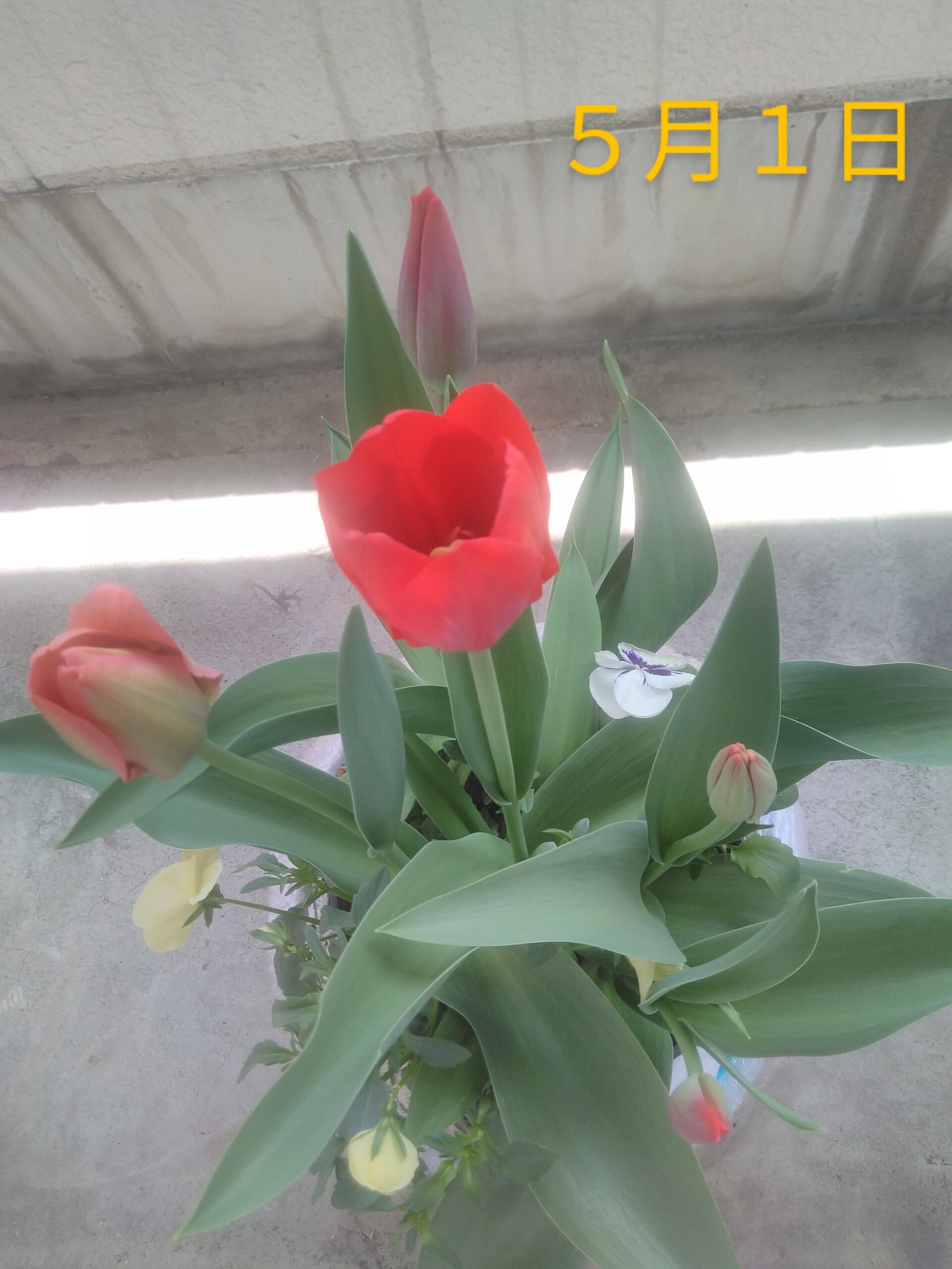 「5本のチューリップが綺麗に咲きました。赤系グラデーションが綺麗でとても幸せな気分になりました。」とのコメントもいただいています。
