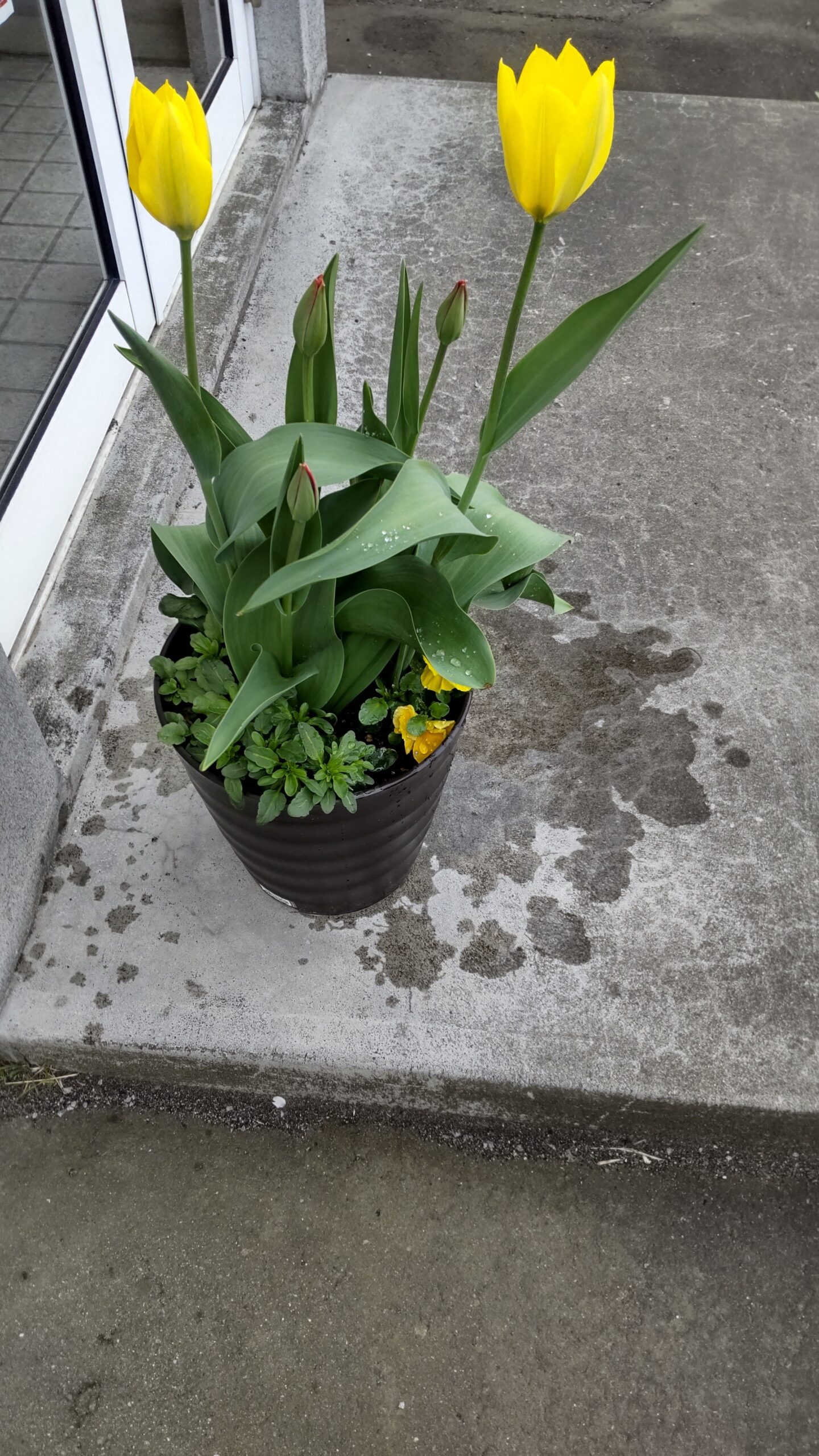 濃いイエローと淡いイエローのチューリップの組み合わせが元気をくれますね。これから咲いてくるパンジー・ビオラがどんな色合いなのか楽しみですね。