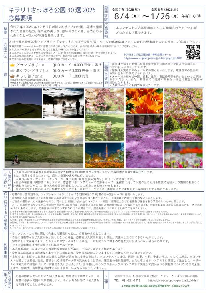 応募方法や作品に関する注意事項などの詳細は「キラリ!さっぽろ公園30選」のページよりご確認下さい。