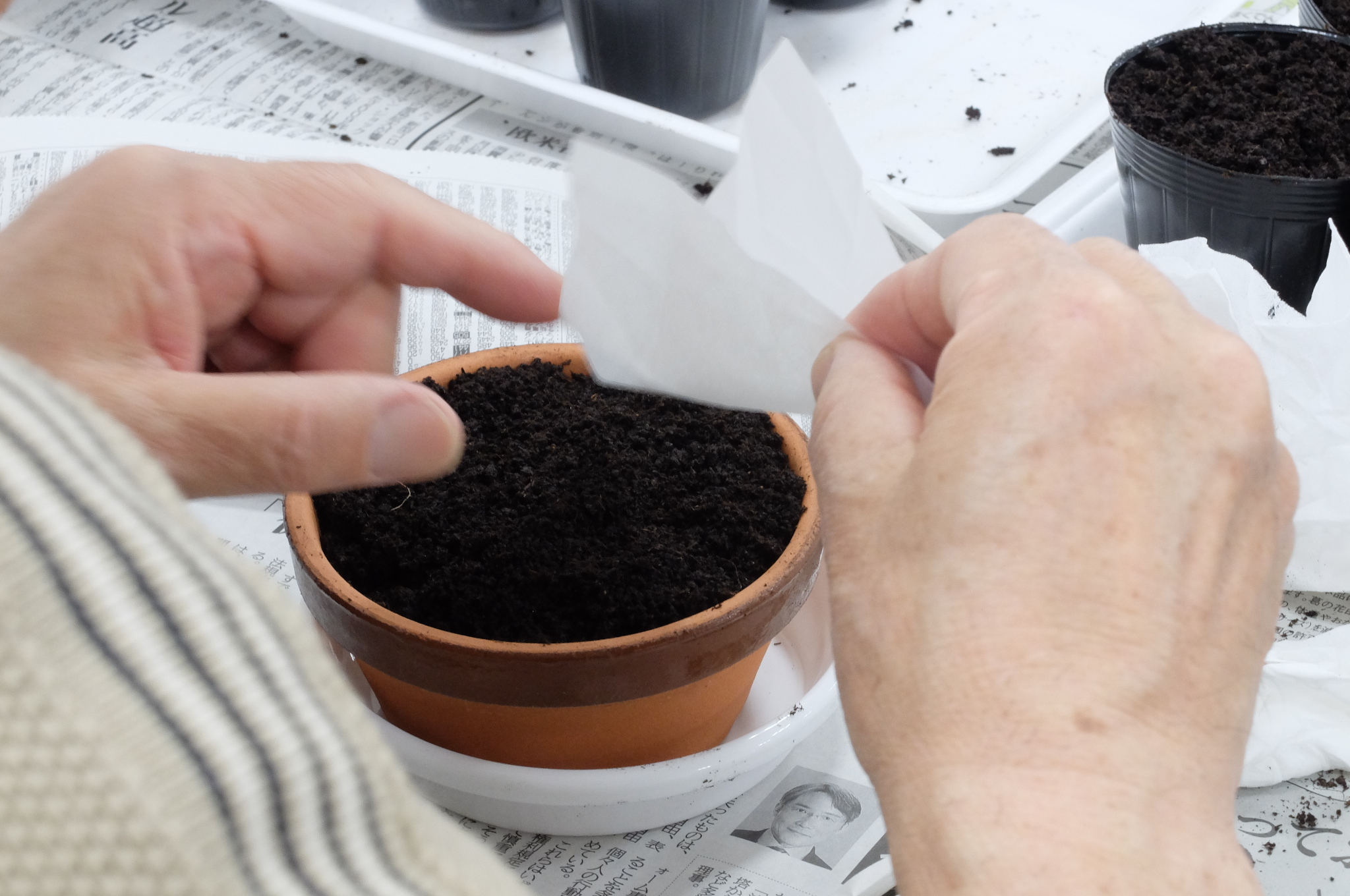 まずは3.5号の平鉢にロベリアの種を播きます。ロベリアの種はとても細かいので、皆さん集中して慎重に作業を行っていました。