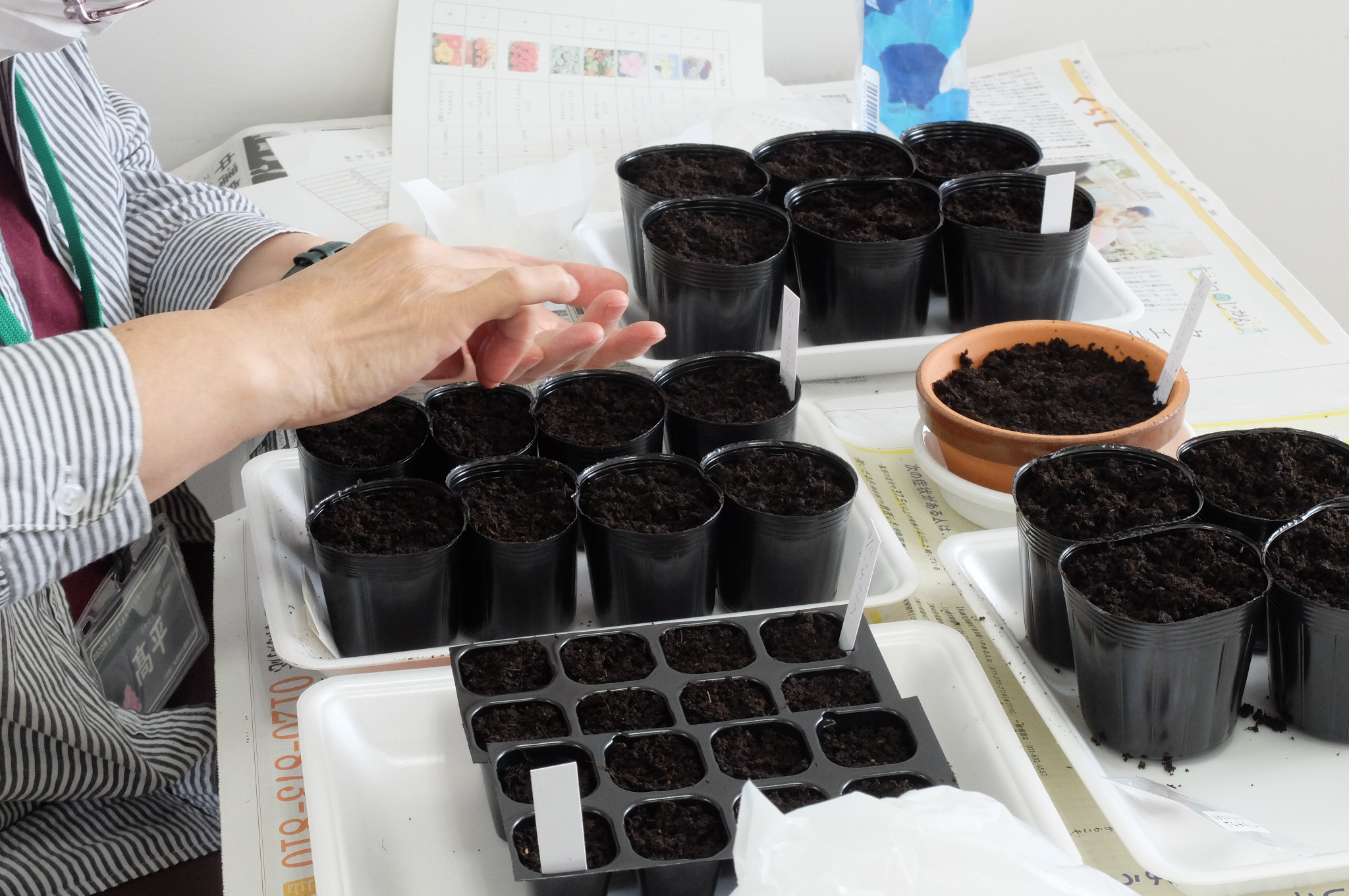今回はポット、プラグトレイ、平鉢を使って種まきを行いました。