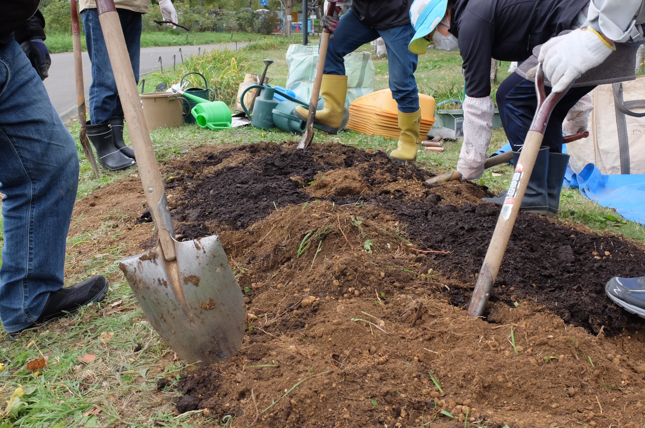 掘り上げた株に吸水させている間に土壌改良も行い、植え戻しました。