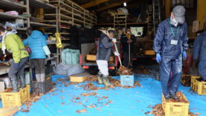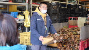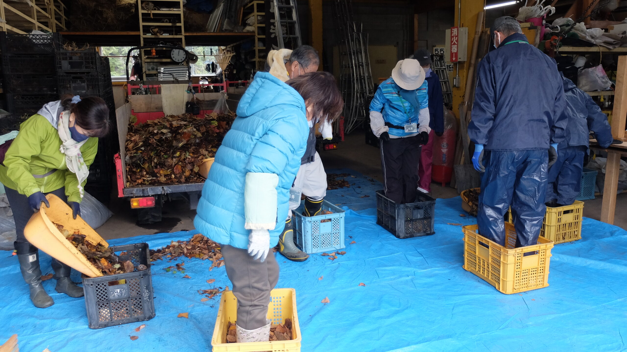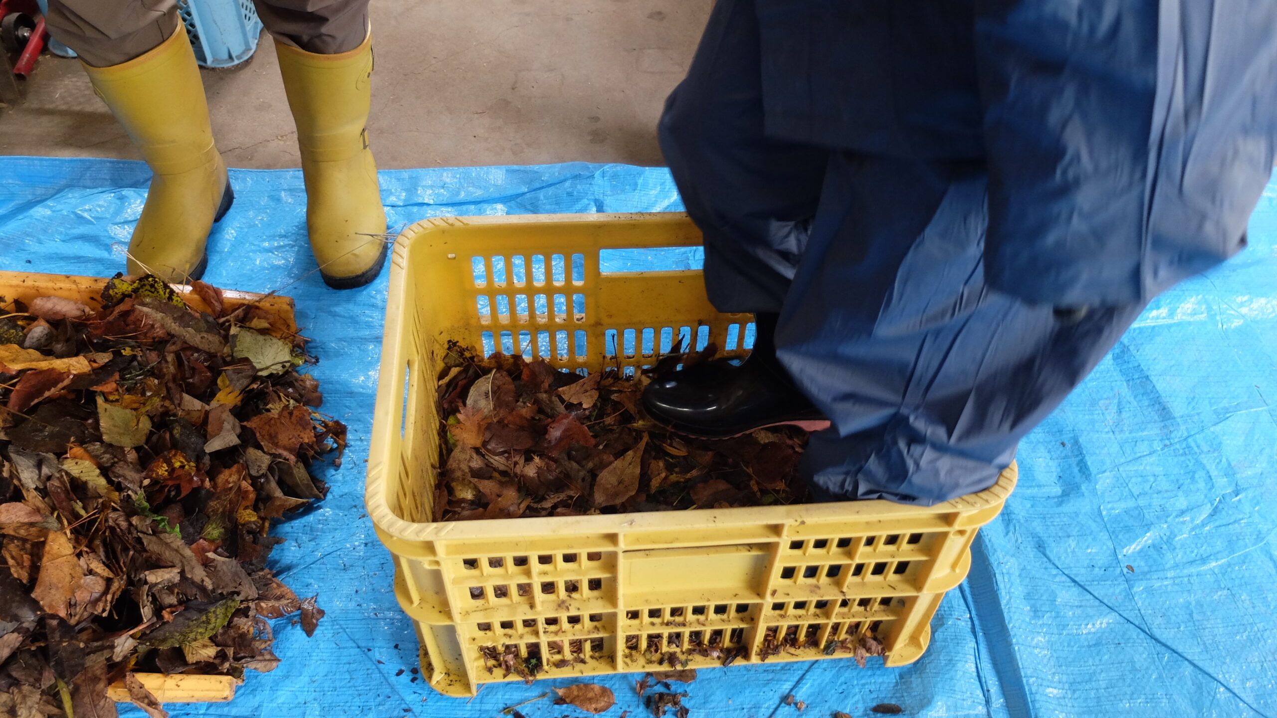 講義の後はいよいよ落ち葉堆肥づくりです。この日は雨が降ったり止んだりと不安定な天候だったので、倉庫内でコンテナを使って落ち葉堆肥を作りました。