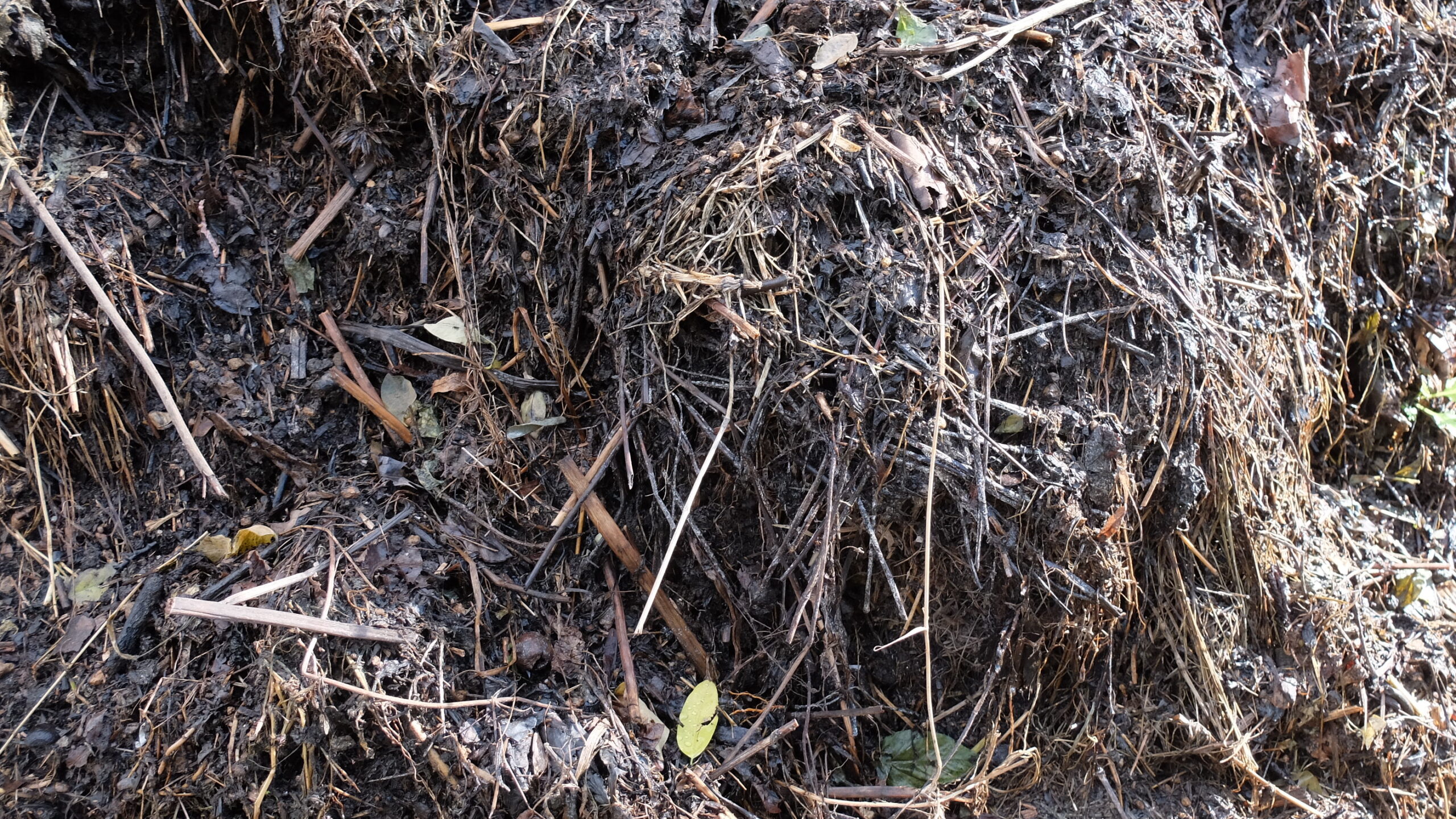(写真左上)刈ったばかりの植物を堆積して保管していました。堆肥化が進むと(写真右上)のようになりますが、まだ繊維が残った状態なので、堆肥としてはまだ利用できません。