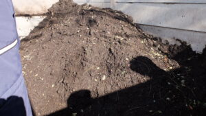 (写真右下)は一昨年作った落ち葉堆肥です。堆肥化が進んで利用できる部分とコンテナの端に入っていたきちんと踏み固まっていなかった部分とがありました。
