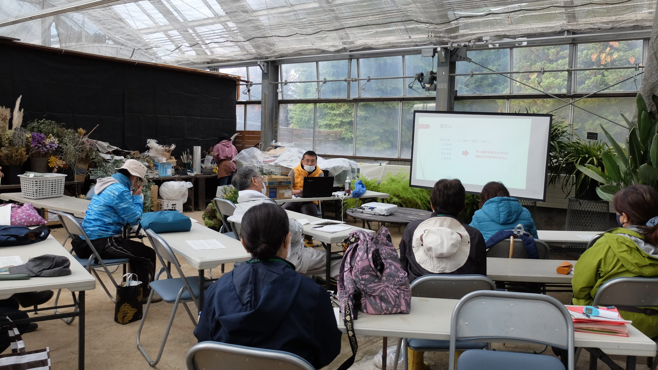 はじめに講義形式で土の種類や植物の成長に必要な栄養素、なぜ土づくりを行うのか、肥料と堆肥の違い等を学びました。