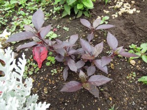 | 赤の花壇には赤ダリアの「ビショップオブルランダフ」を | ピンクの花壇には、白いダリアを |