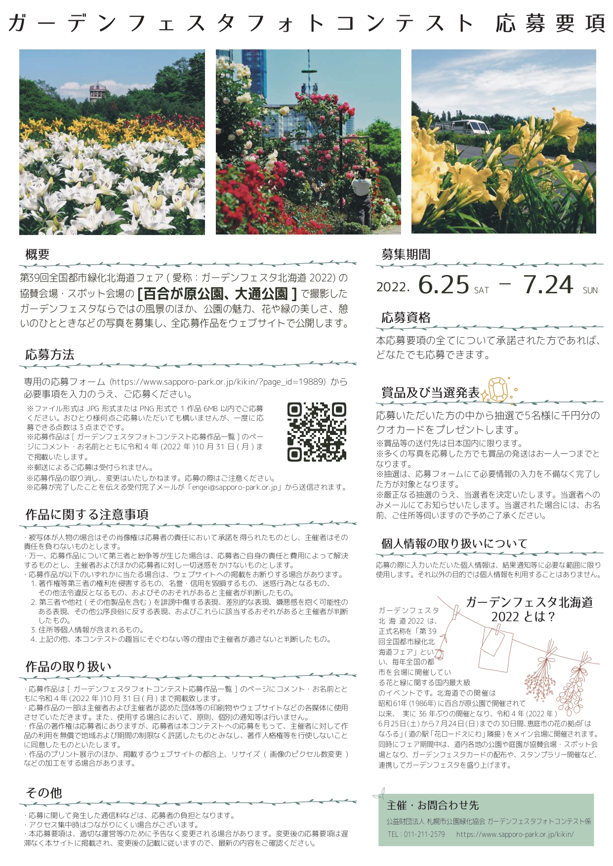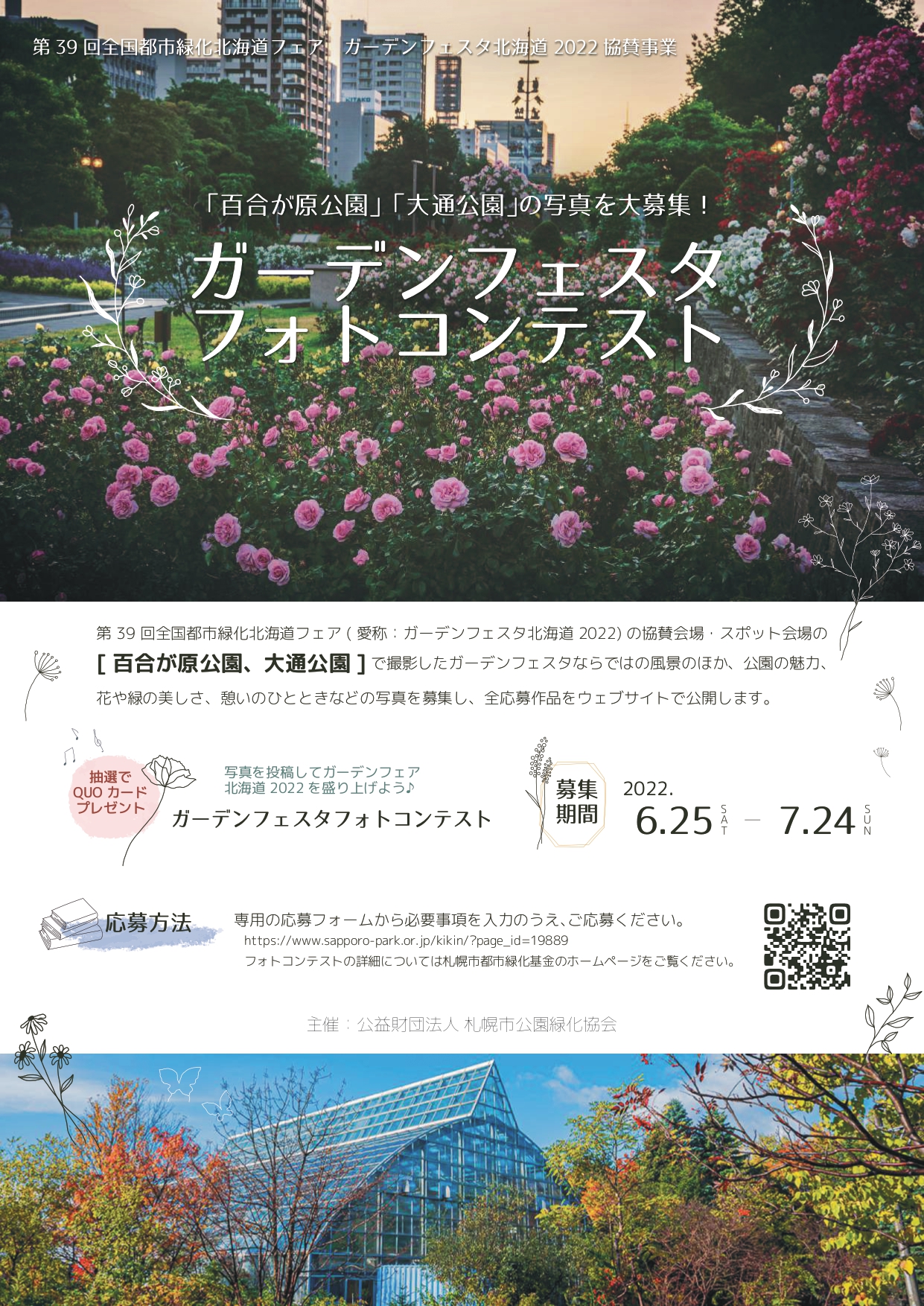 「ガーデンフェスタフォトコンテスト」では第39回全国都市緑化北海道フェア(愛称:ガーデンフェスタ北海道 2022)の協賛会場・スポット会場の[百合が原公園、大通公園]で撮影したガーデンフェスタならではの風景のほか、公園の魅力、緑や花の美しさ、憩いのひとときなどが伝わる写真を募集し、全応募作品をウェブサイトで公開します。