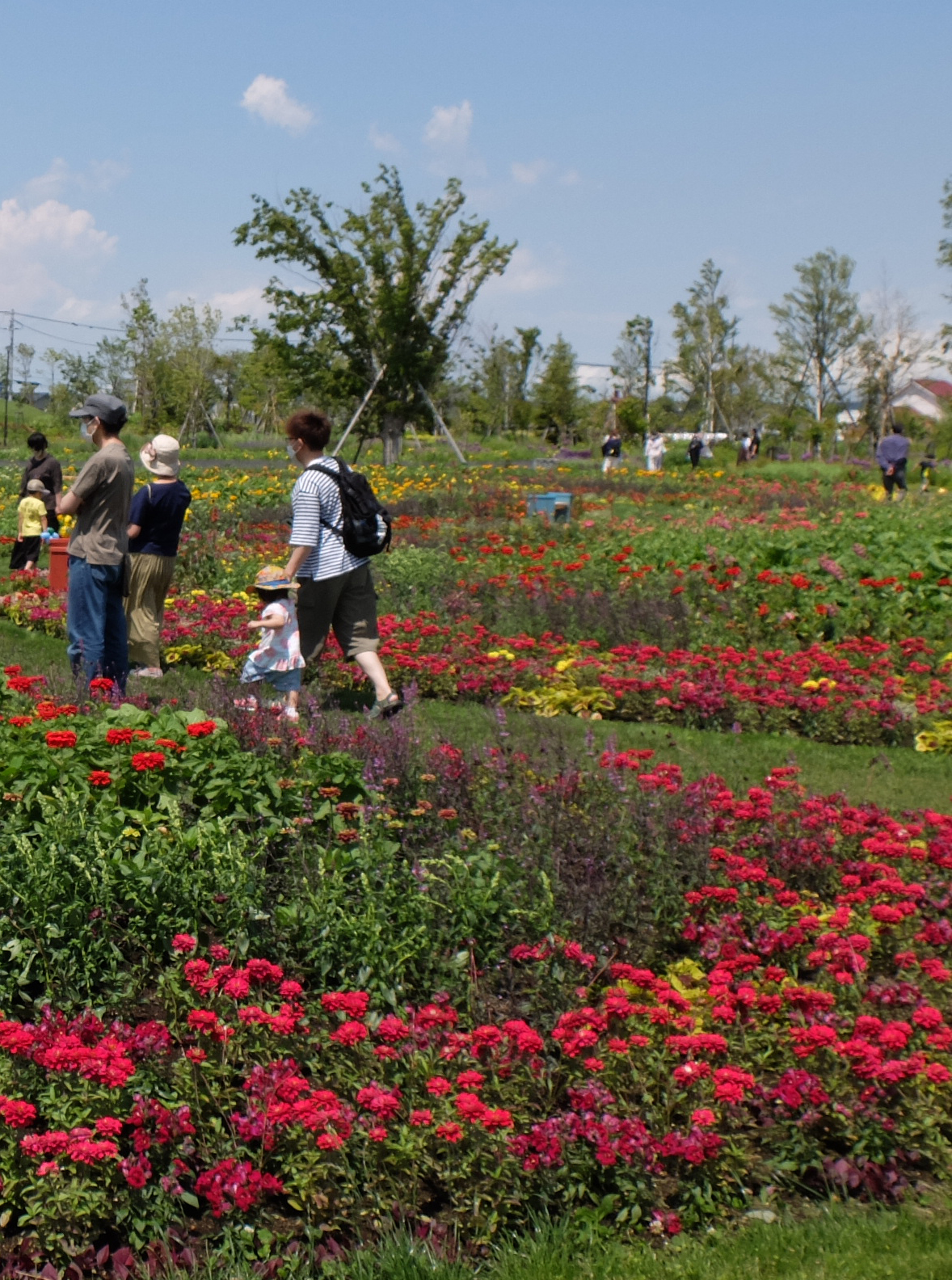 中央広場に設けられた大花壇は24000株以上の花が植えられていて、8割5分方、恵庭産の花が使われ、外側から見た時と花壇内の遊歩道から見た時とで違った色が見えるようにデザインされているそうです。