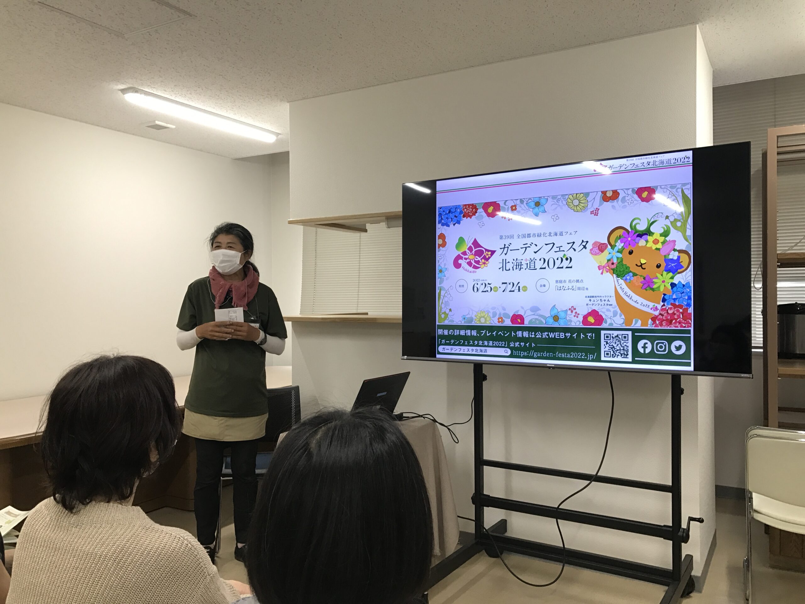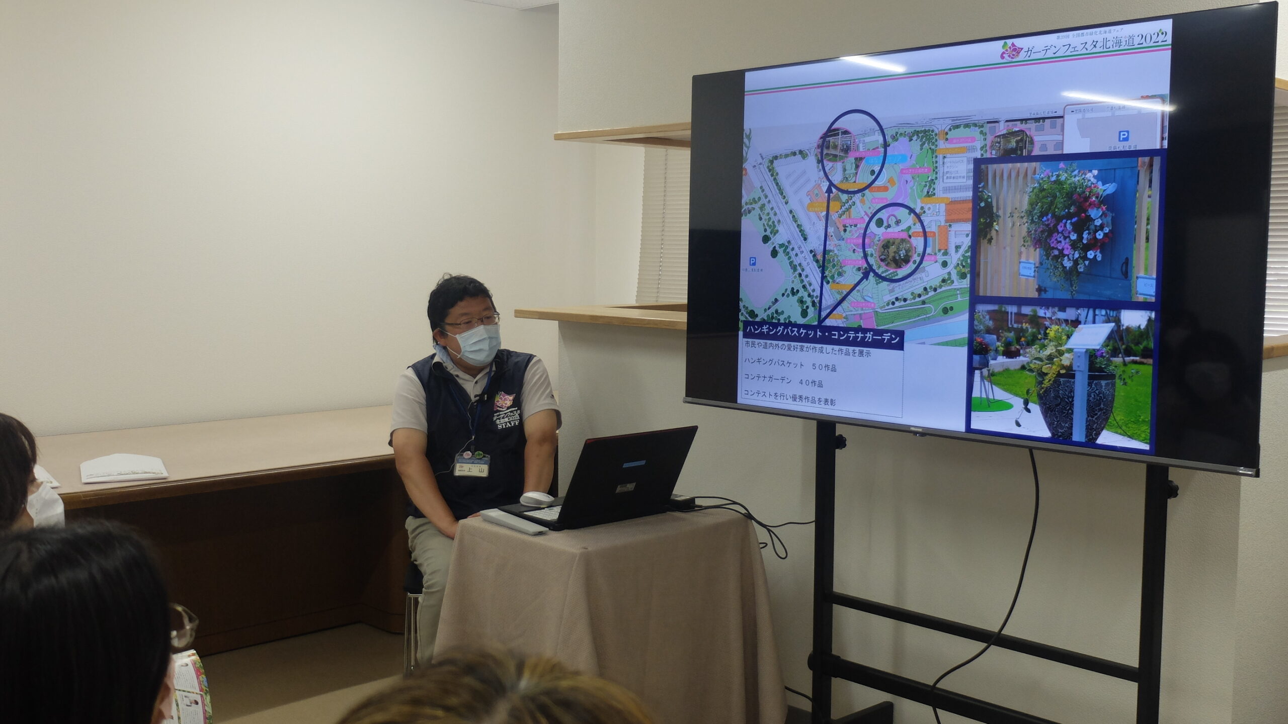 今回の講座でははじめに恵庭市の上山様からガーデンフェスタ北海道 2022の概要を、何度か講師を務めていただいた土谷様からはフェアの見どころをお話いただきました。