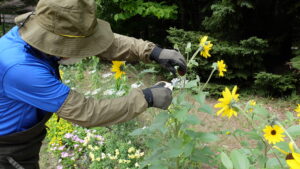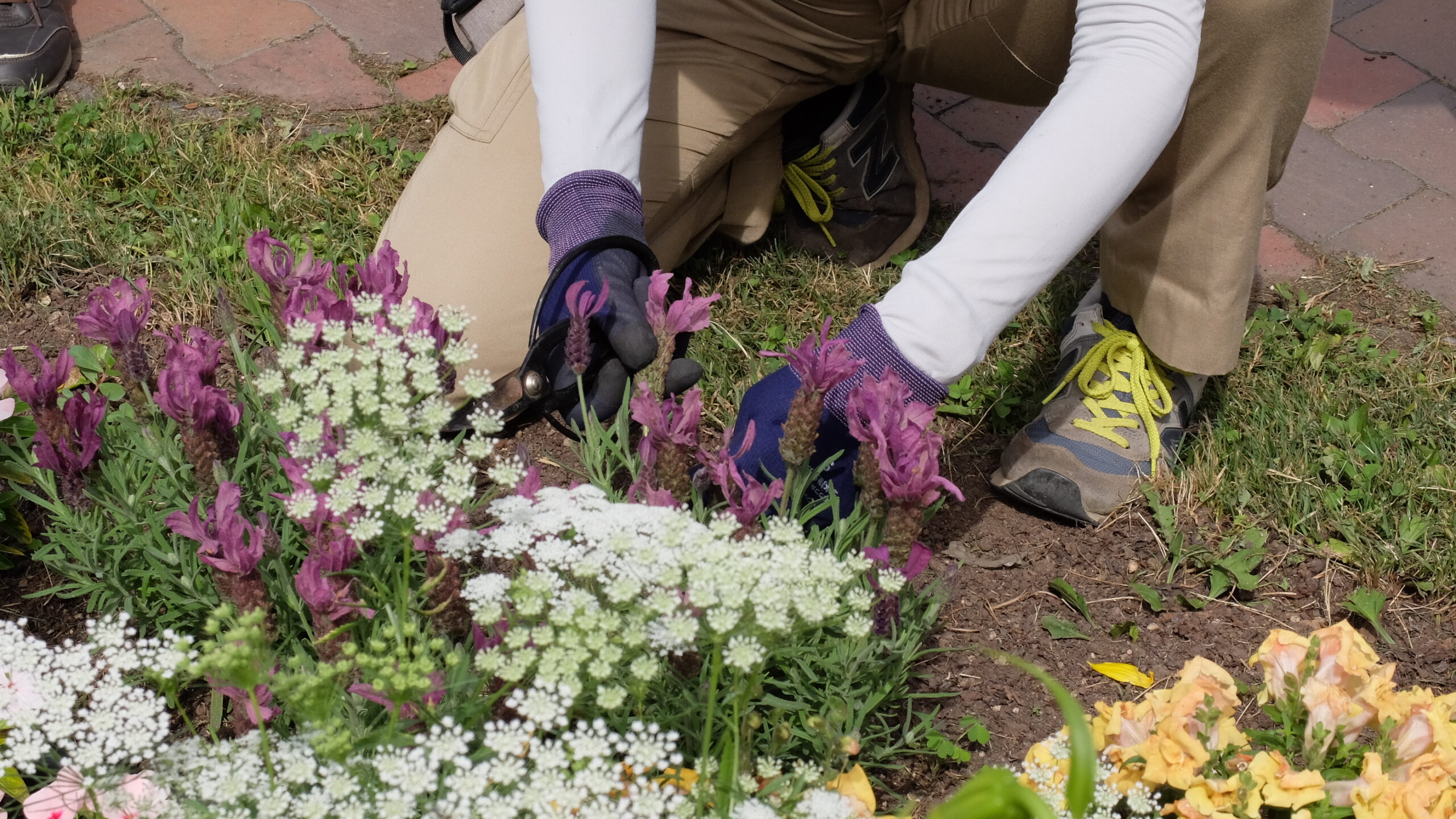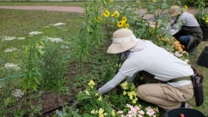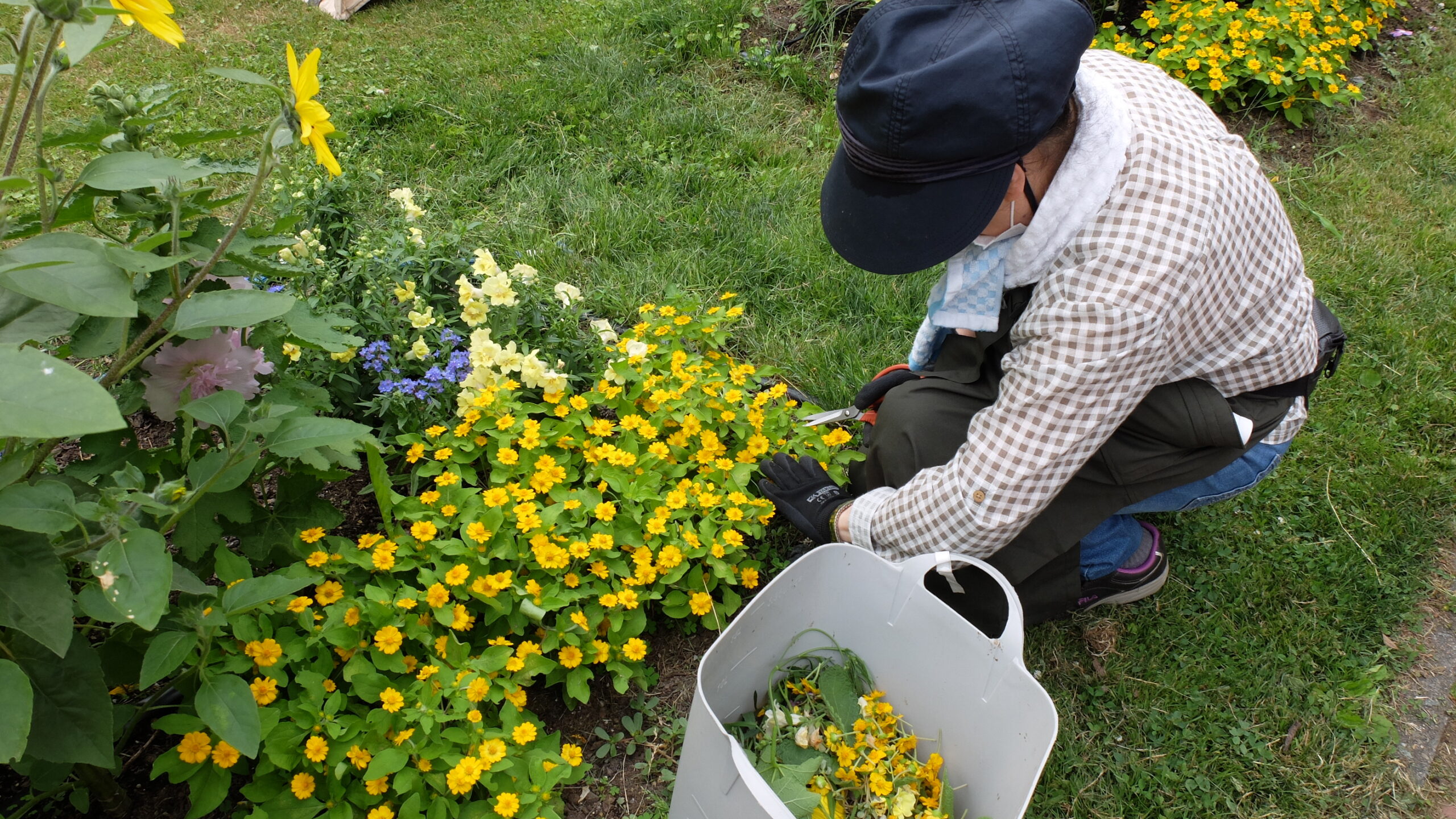 今回も百合が原公園の戸倉職員に切り戻しのポイント等を教わりながら、ヒマワリやキンギョソウ、メランポジウム、フレンチラベンダー等の花がら摘みや切り戻し、除草を行いました。