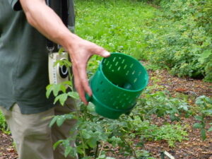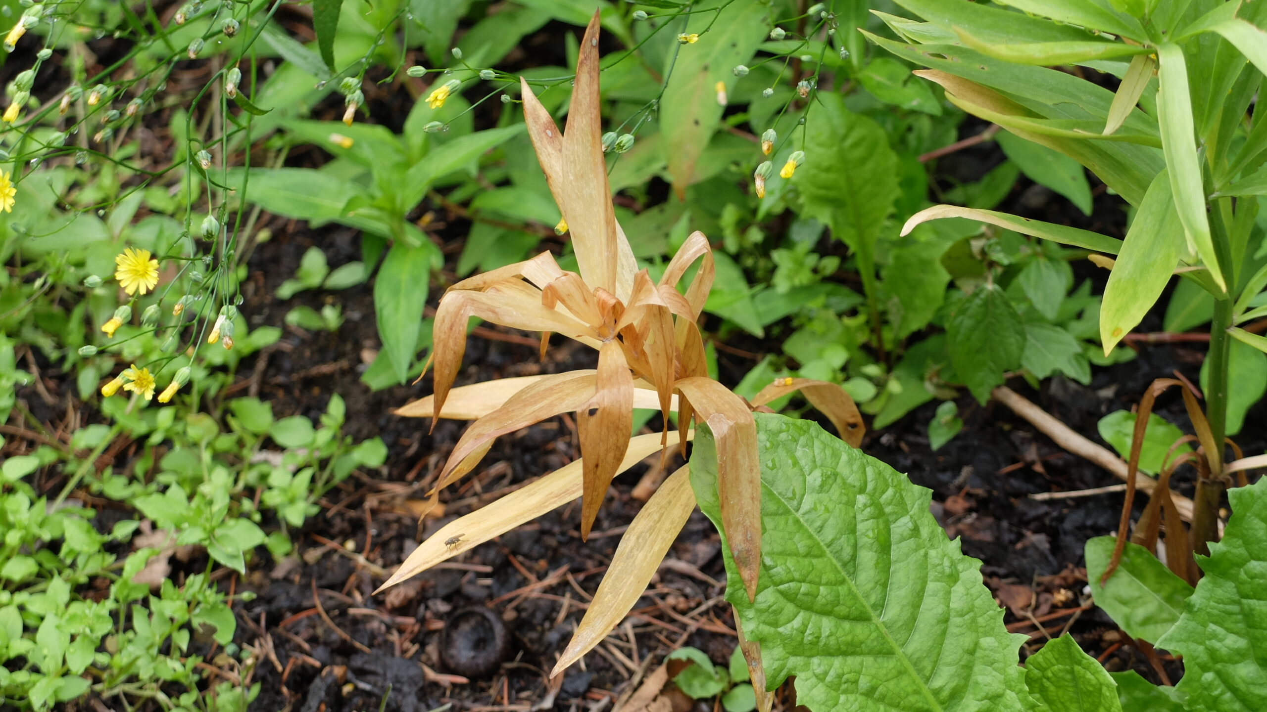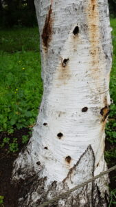 このほか、コガネムシのフェロモントラップや白樺のカミキリムシによる食害の跡を見たり、灰色カビ病が発症しているユリ等を見ました。