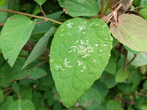 写真はカツラの葉にあったヨコバイの吸汁跡ですが、カツラのほか、バラの葉でも見られました。