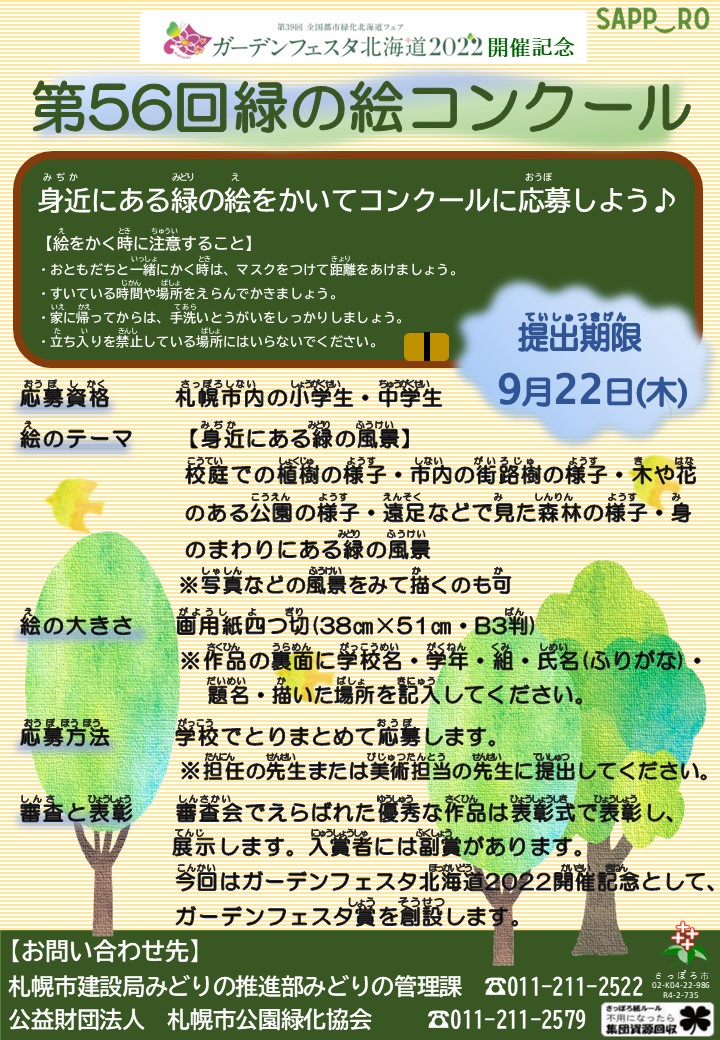 現在、札幌市内の小学生・中学生を対象とした第56回緑の絵コンクールの作品を募集しています。