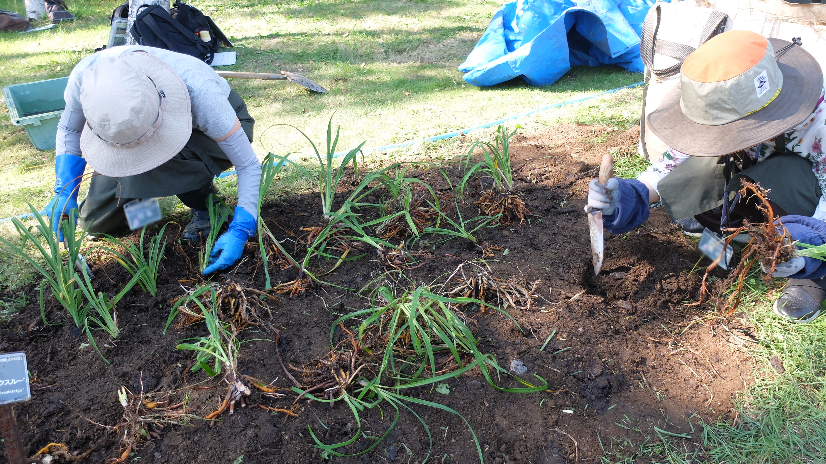 芽の出来る位置や宿根草について学んだ後はいよいよ実習です!今年もヘメロカリスの株分けを行いました。