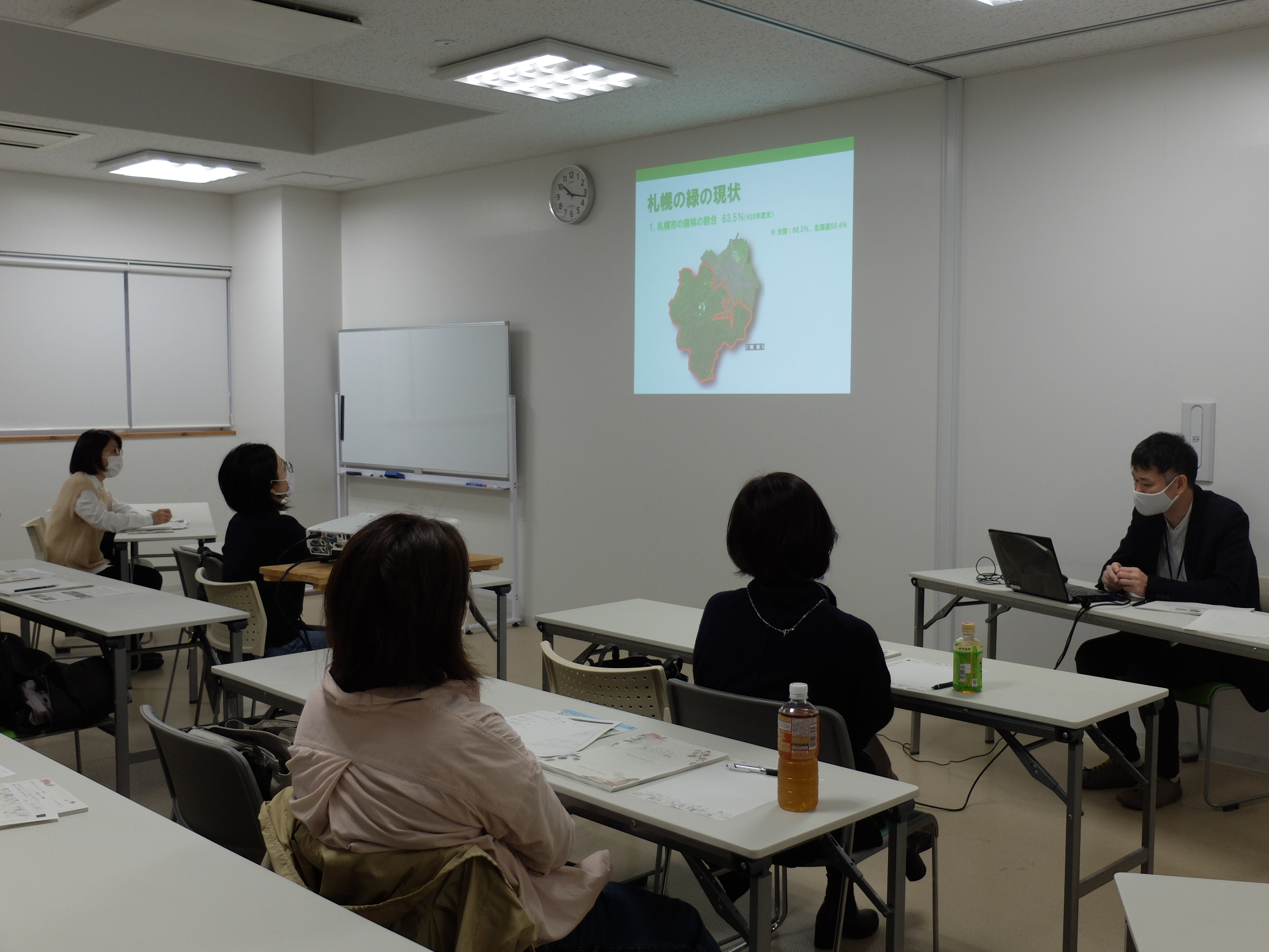 札幌市における”みどり”づくりの歩みや計画、札幌の街の変遷、都市緑化係でされている市街地のみどりを増やすために行っている取り組み等について時折クイズを織り交ぜながらお話いただきました。
