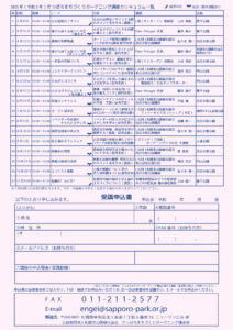 お申し込みについては当協会で管理する公園管理事務所などで配布しているチラシ裏面の「受講申込書」に必要事項をご記入のうえ、FAXまたは郵送でお申し込みいただくか、下記の<必要事項>を記載の上、e-mailにてお申し込みください。
