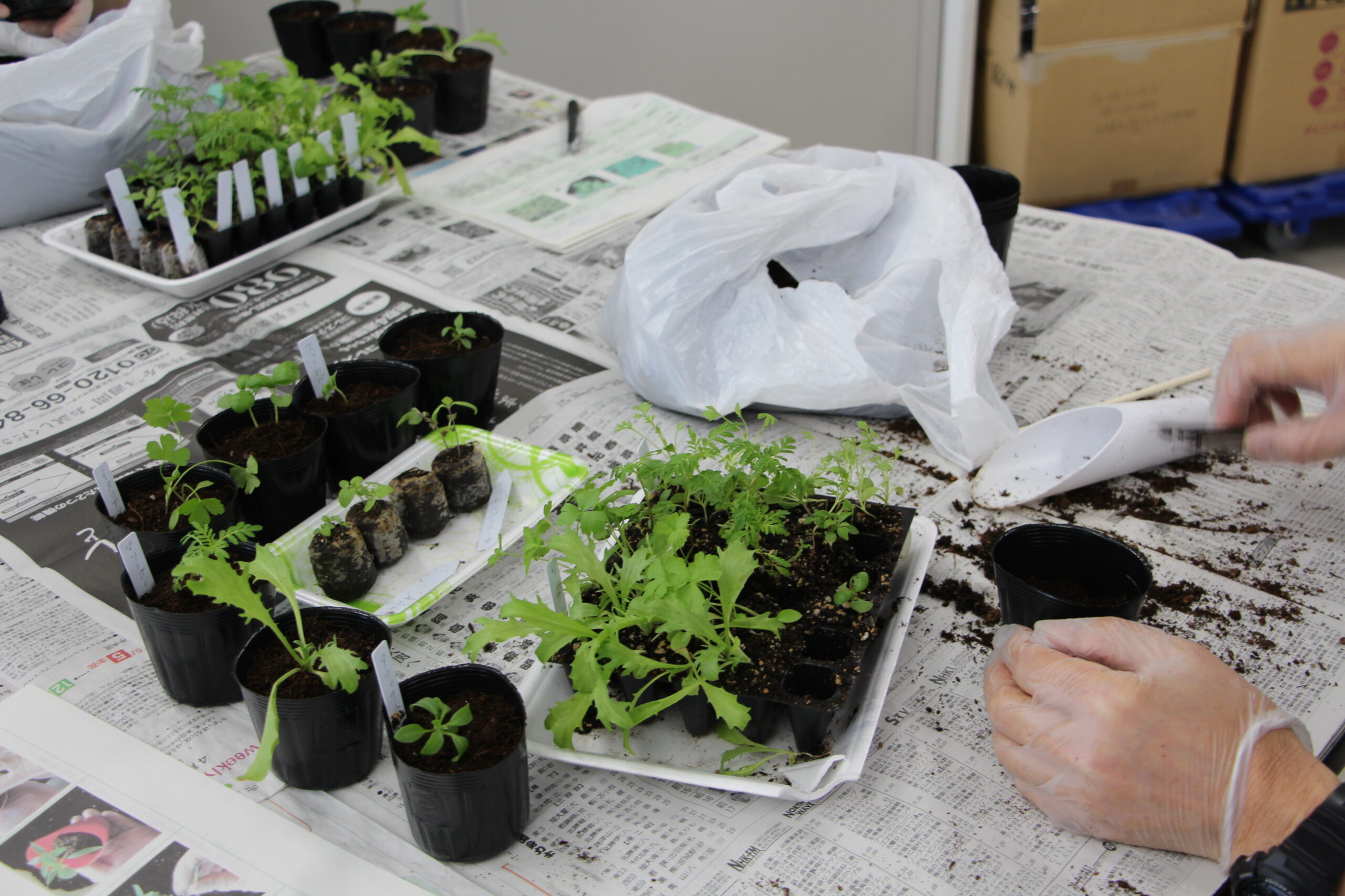 今回は、4月の実習でセルトレイに種をまき、各自が自宅で育てた苗を持参してポット上げを行う実習です。