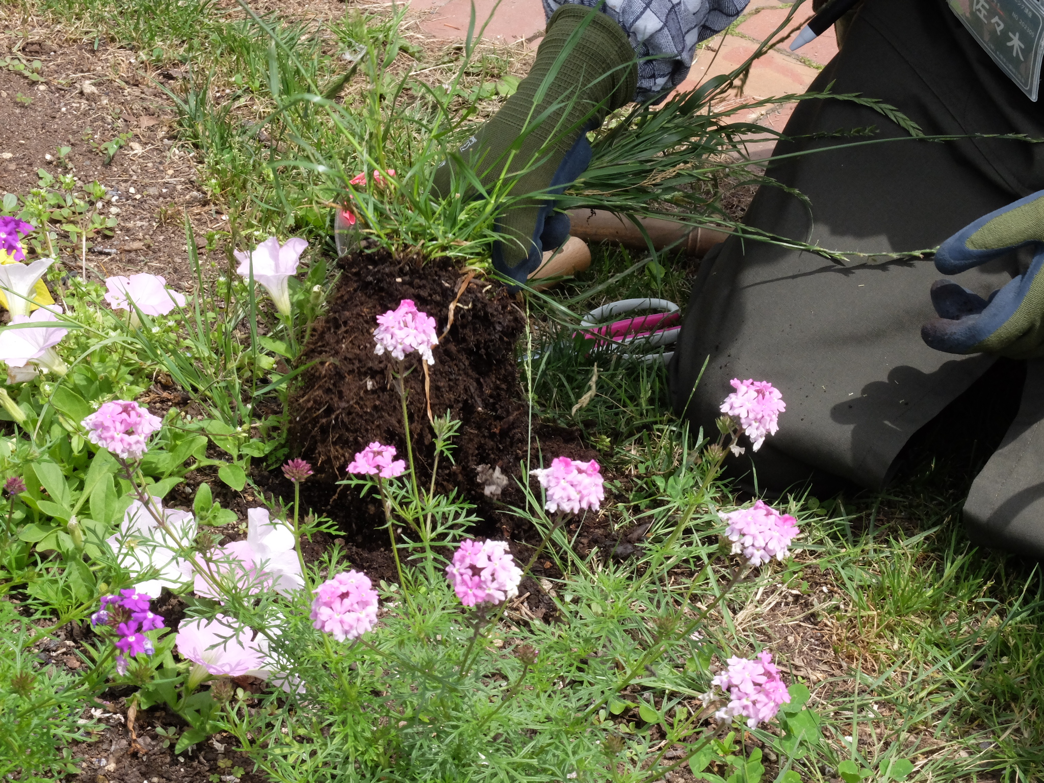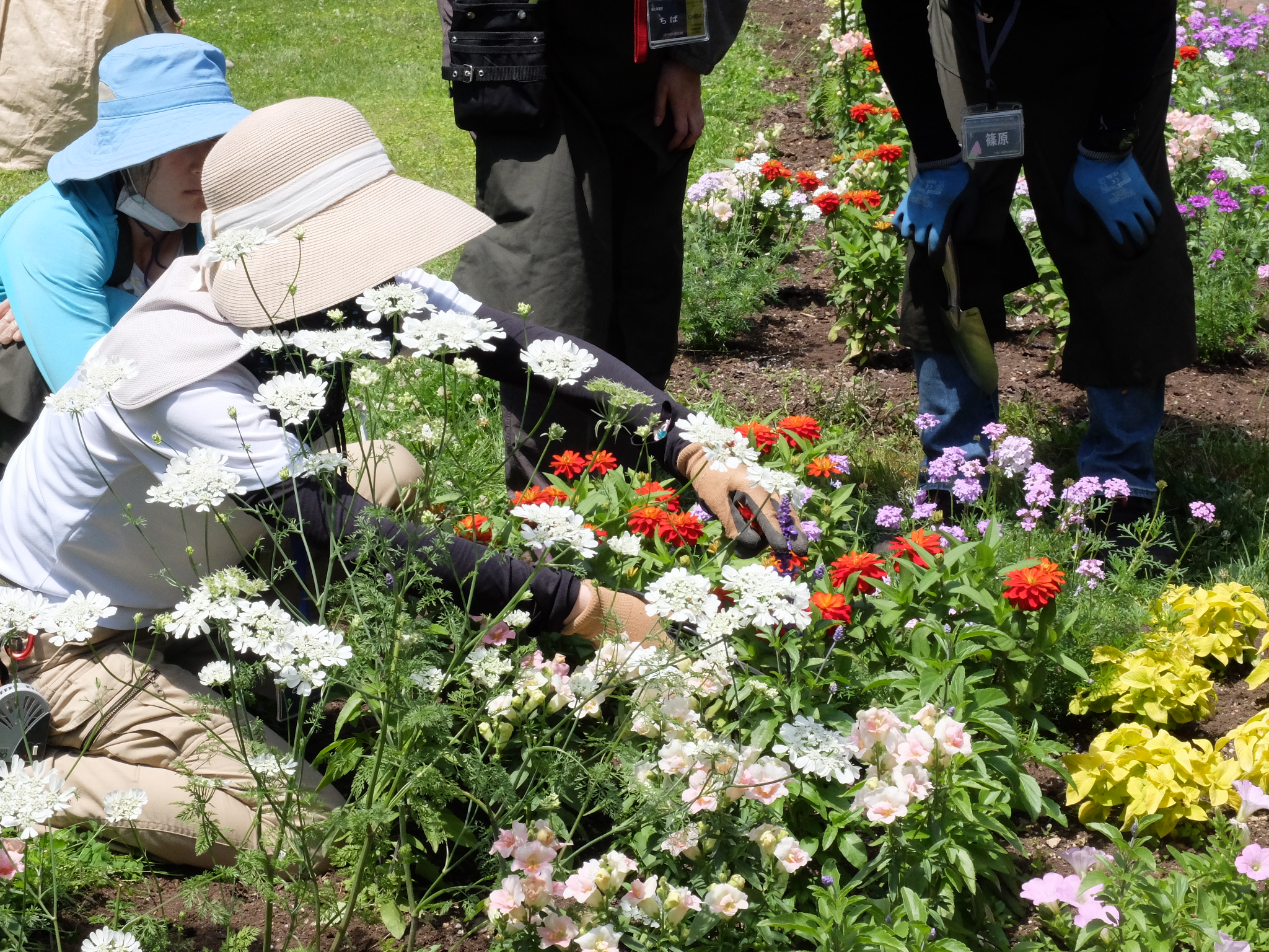 戸倉講師から施肥の仕方、花がら摘みのタイミングや切る位置、目的にあった摘心の方法などの説明を受けた後、まずは、花壇内と花壇周りの除草を行いきれいにしました。