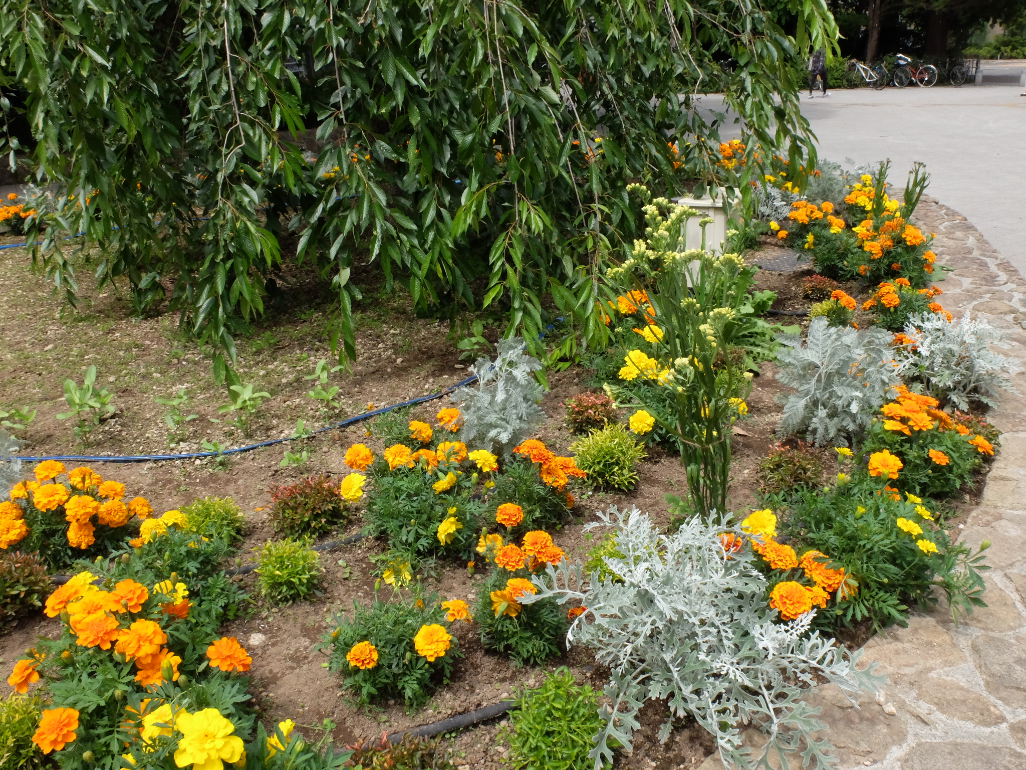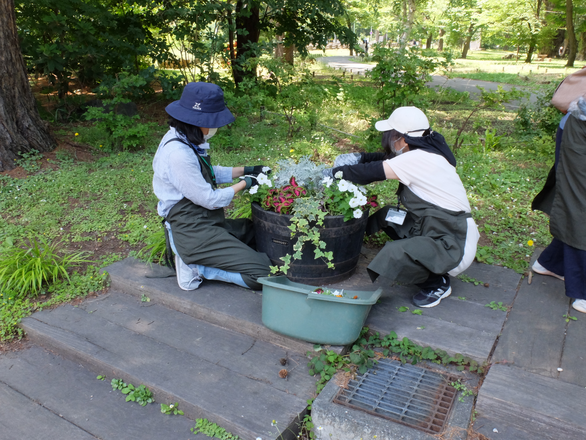 課外活動は、メンテナンス活動を行いながら自分たちで植えた植物の生長の過程を見守っていこうという自主的な活動です。メンテナンスを行うコンテナガーデンは、約1カ月前、6月3日の実習で受講者のみなさんが制作し円山公園へ設置したものです。