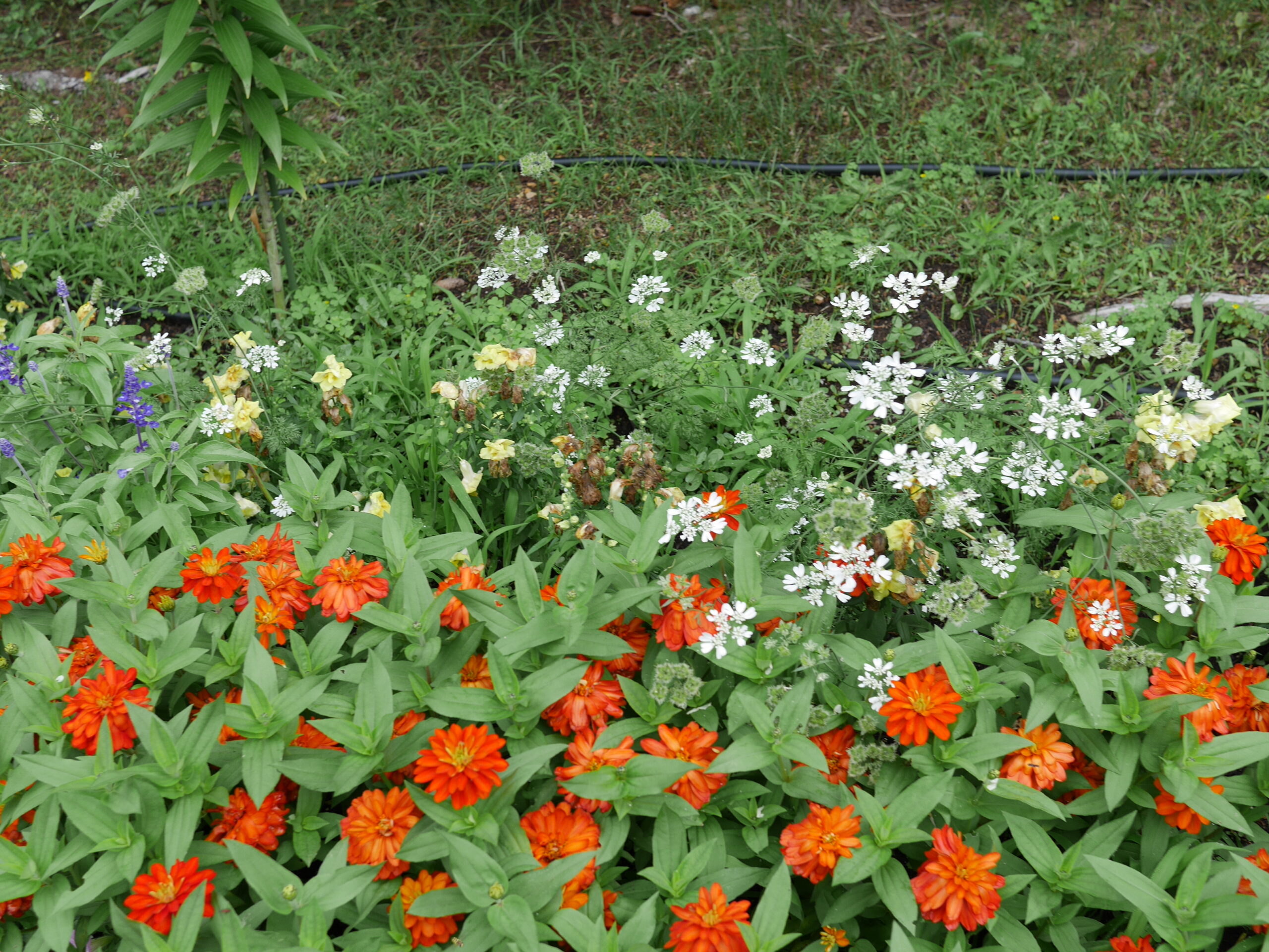 前日の激しい雨のせいか、キンギョソウが茶色く変色し、レースフラワーが種の重さで倒れそうです。