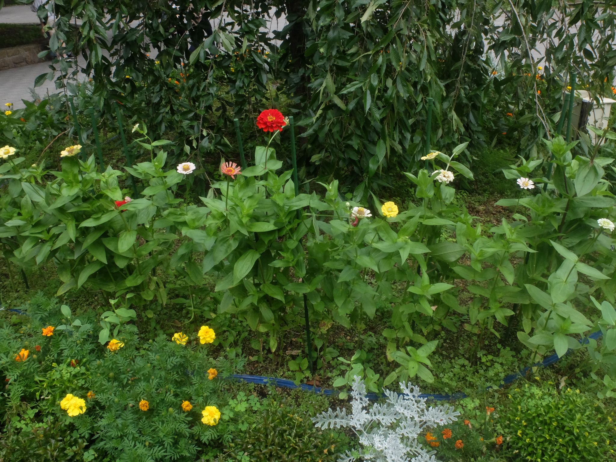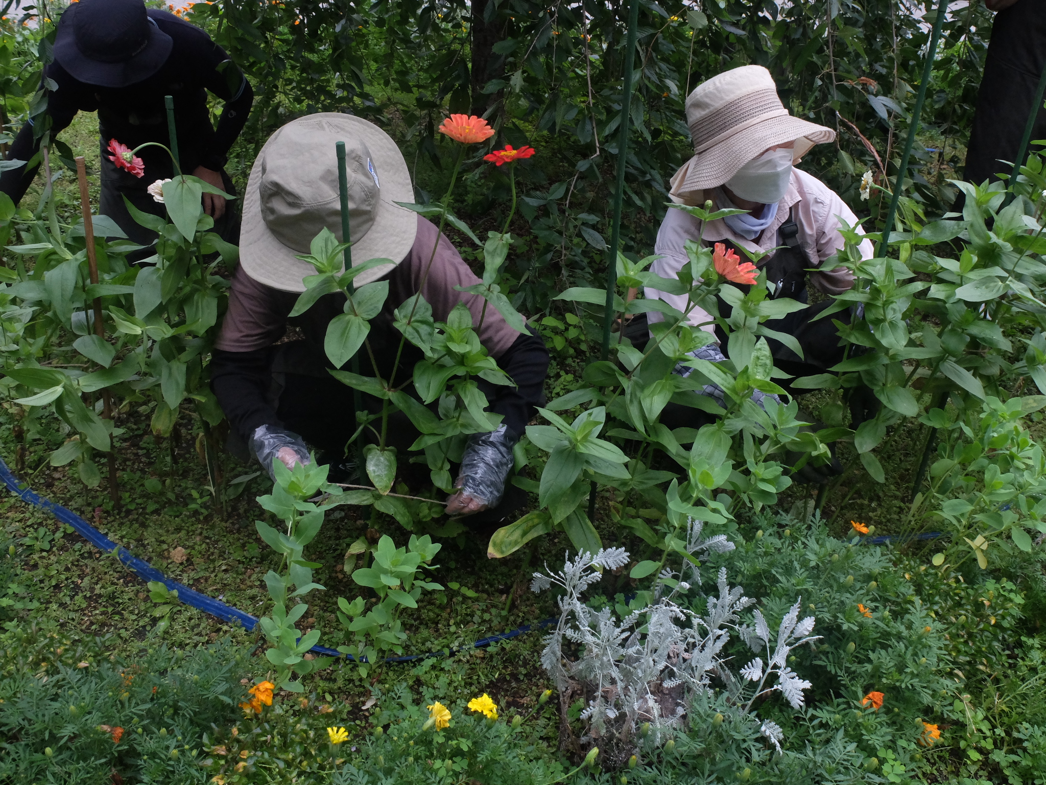 このあとたねダンゴを植栽した円形花壇に移動して、背が高く不安定なものと倒れているジニアの支柱立てを行いました。