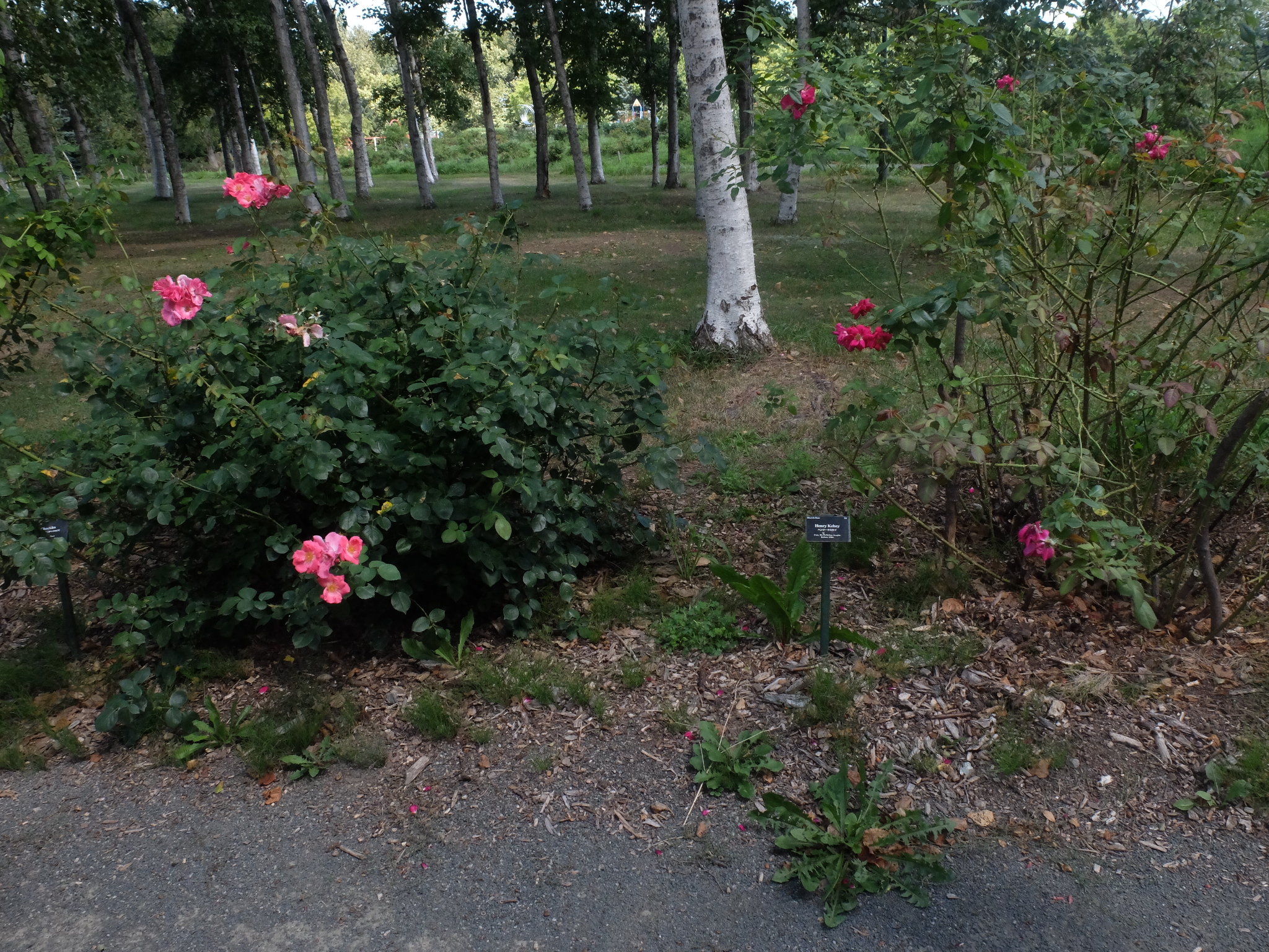 園路脇のバラを見てみると、似た性質を持つバラを同じ場所に植えていても生育に違いがでています。環境の違いはほんの少しでも大きく差がでることもあるのですね。