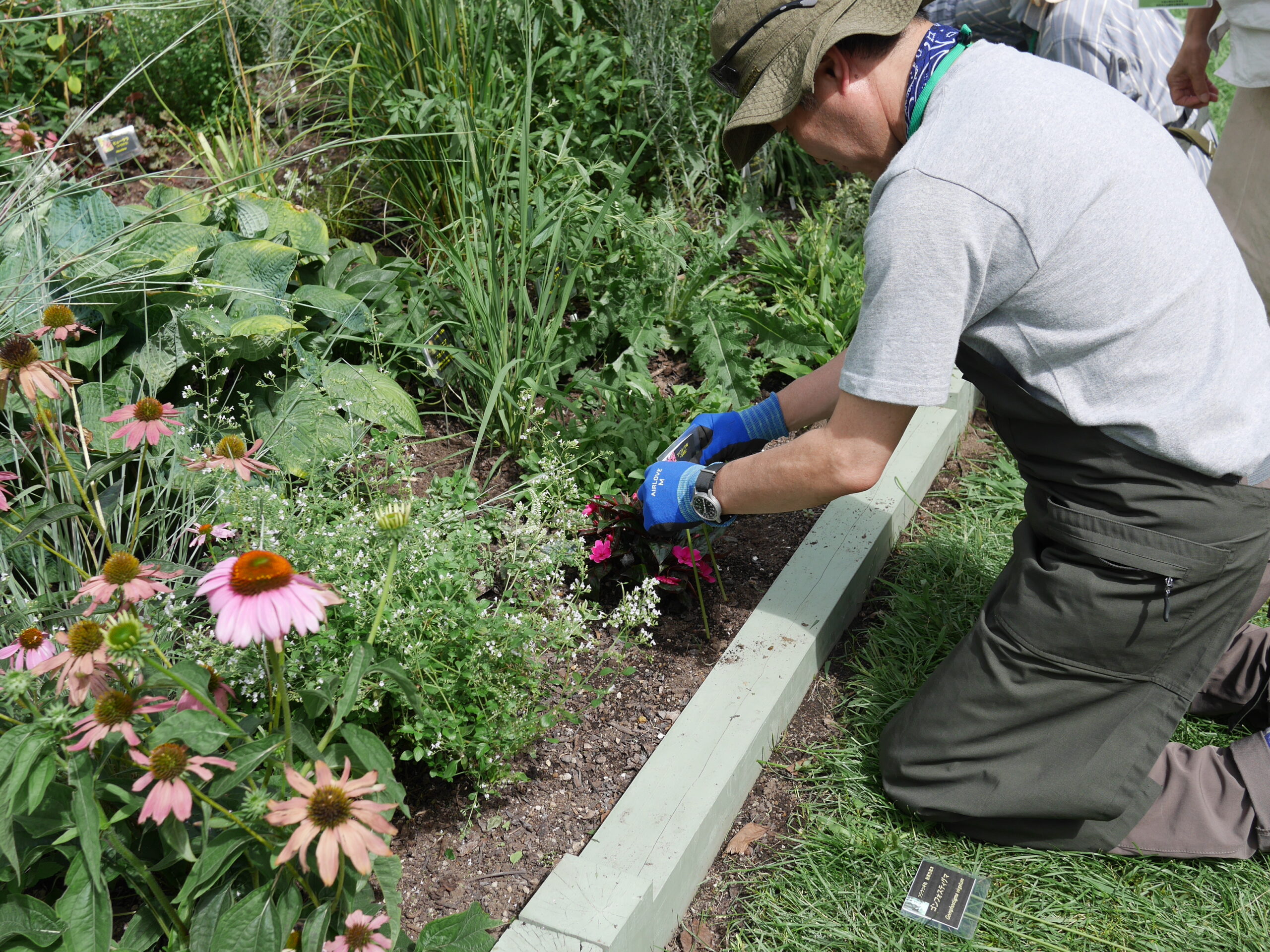 受講生は花の時期が終わり葉だけになっていた植物が何かなかなかわからず、苦労した様子。プランツネームと植物見比べ、教えてもらいながら設置しました。
