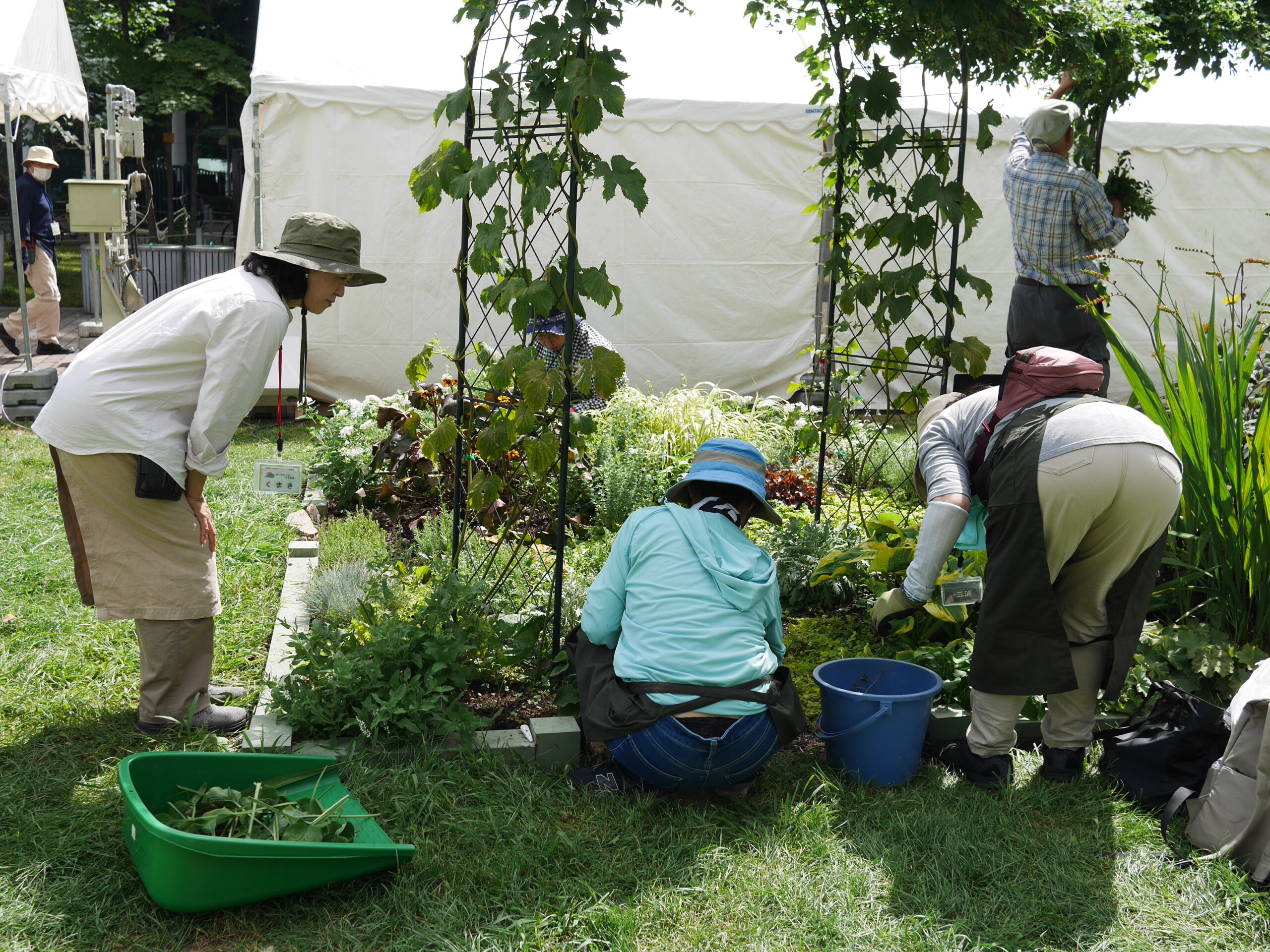 今年度は新しい試みで1面の花壇をアーチとアーチの間を上部で繋ぐように誘引したそうです。ホップの下の小径を通ってじっくり観察するのも楽しいですね。