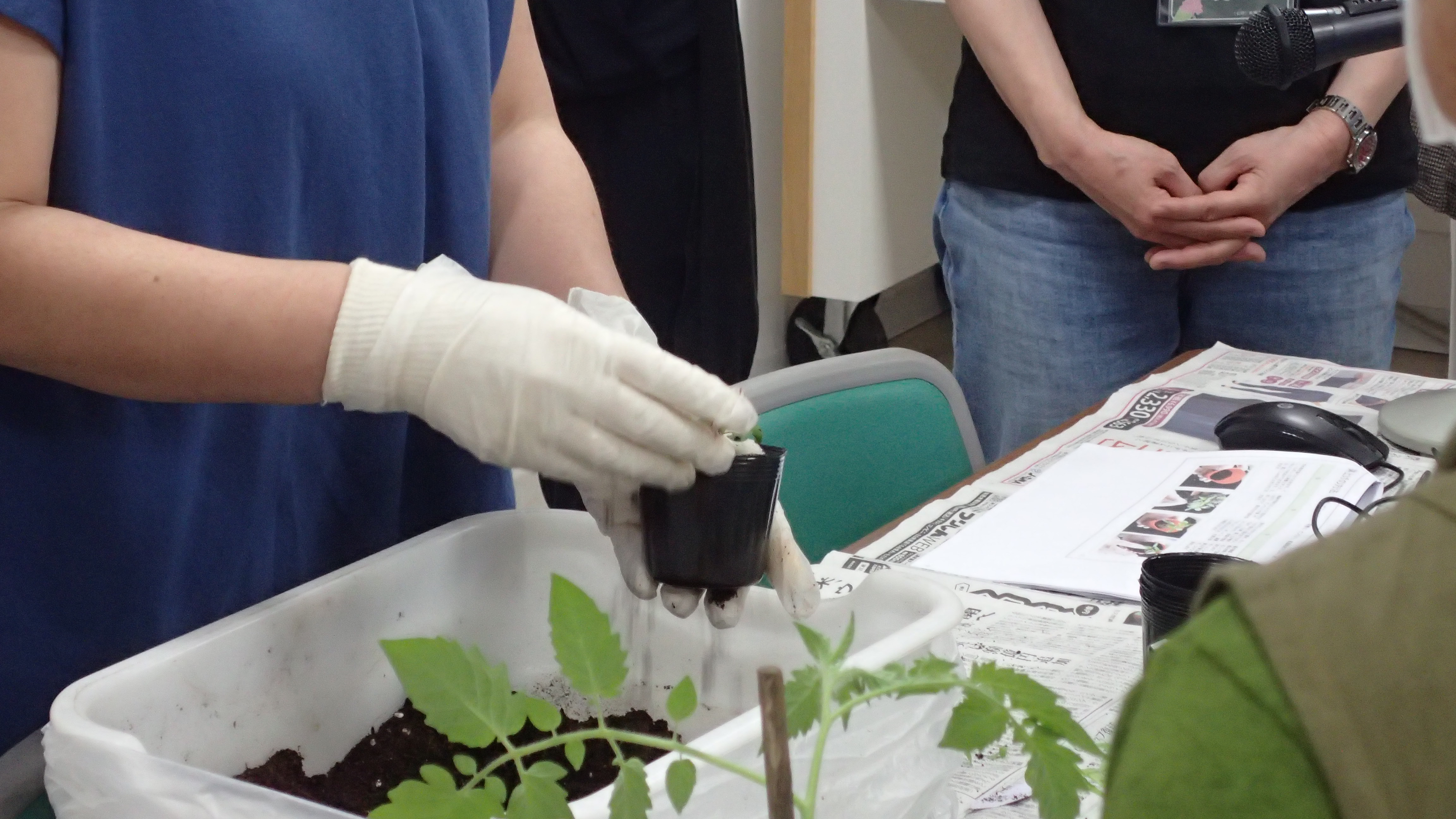 講師によるポット上げのデモンストレーション後、みなさんも間引きや摘心を行いながら、ポット上げを行っていきます。