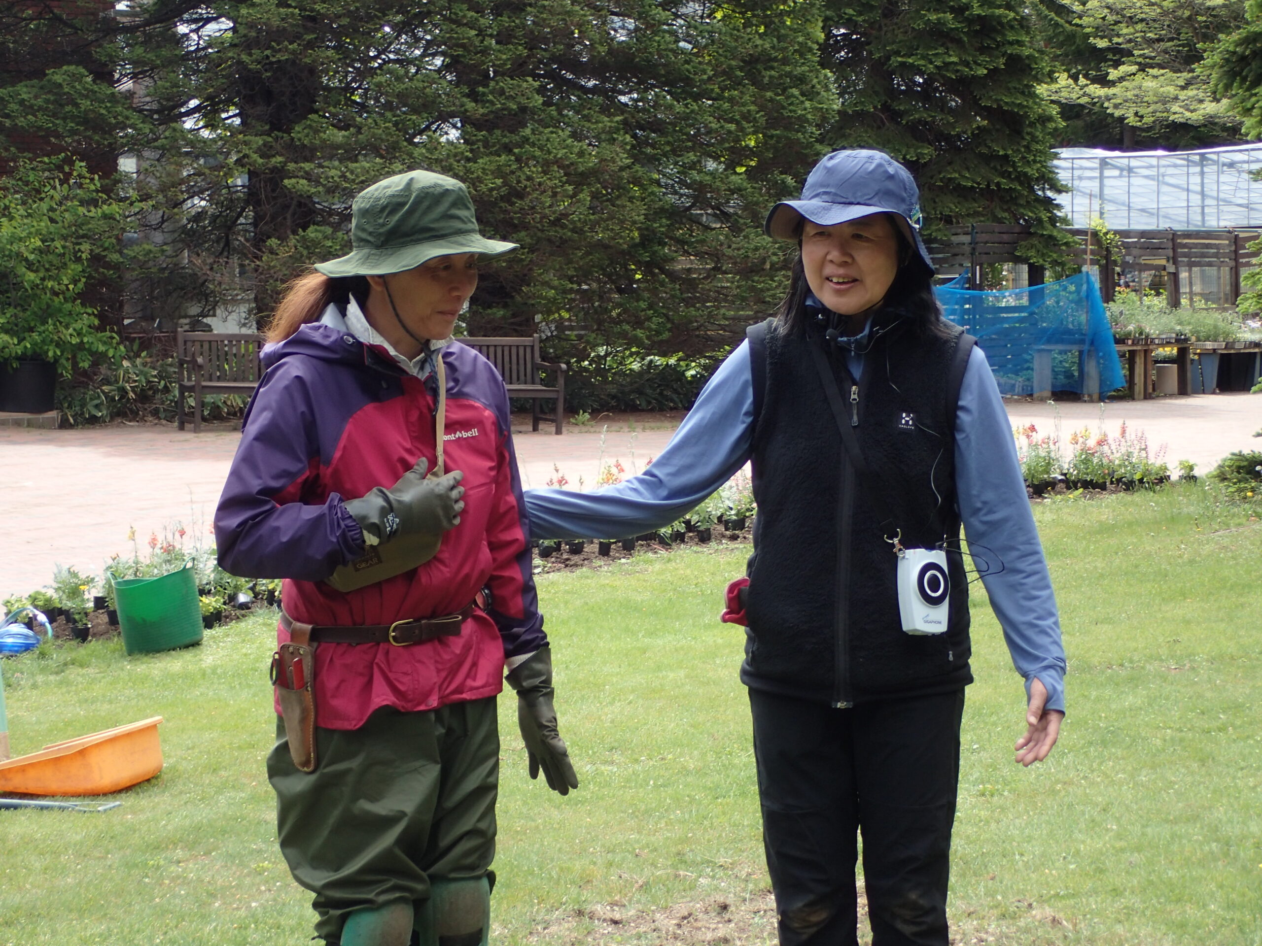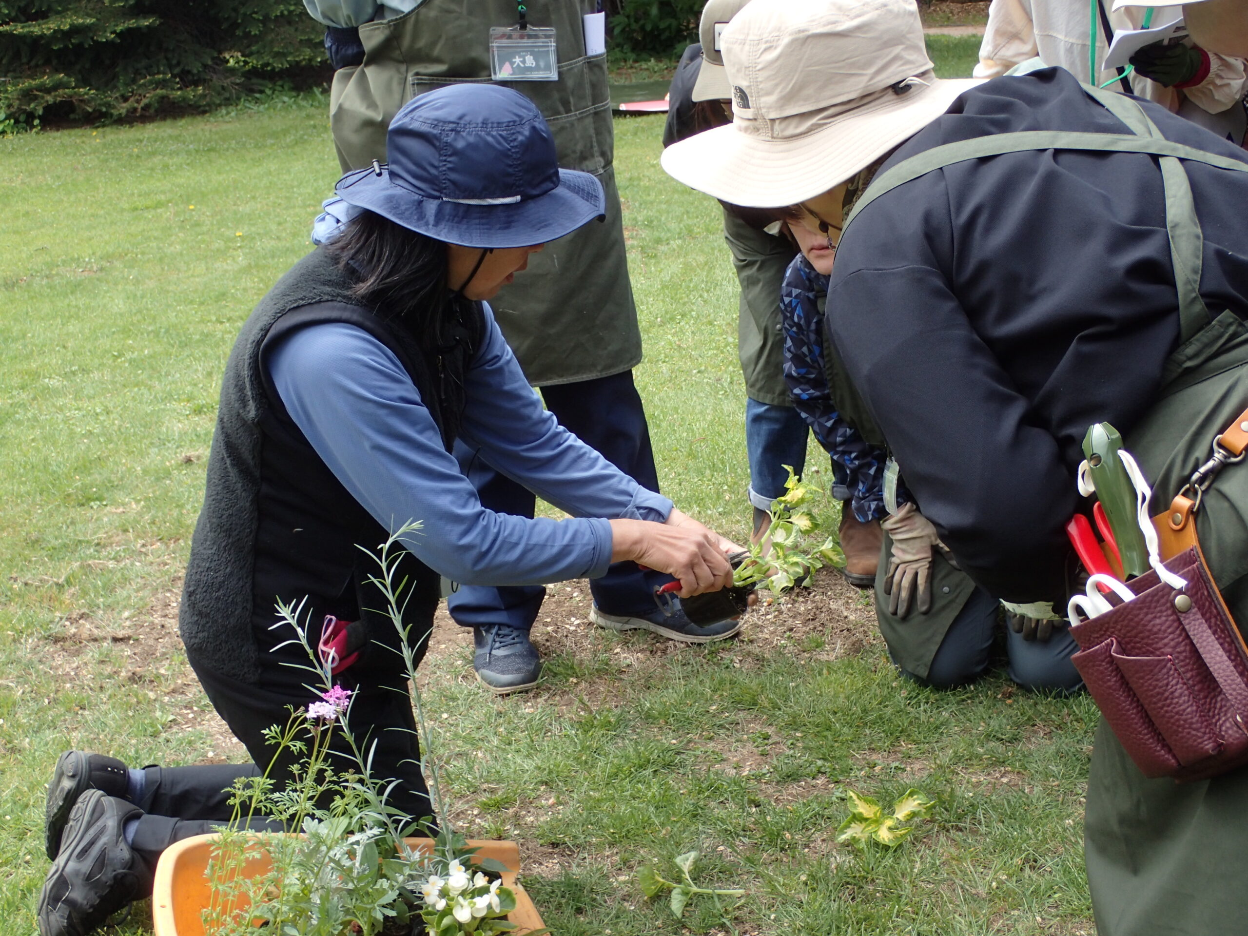 土谷さんのほか、恵庭市で活動されているガーデナー菅田裕子さんにもお越しいただき、お二人には、早朝から1400株以上の花苗を配置して実習の準備をしていただきました。
